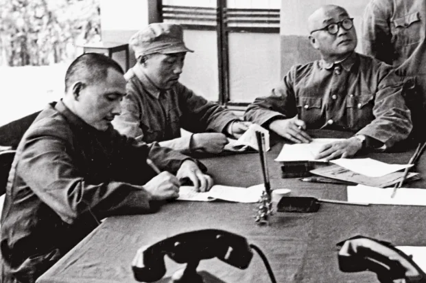 图2:1949年11月,解放军二野开始进军大西南,图为正在指挥部指挥作战的二野首长,中间为副政委张际春