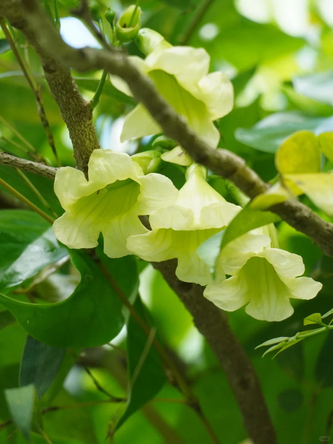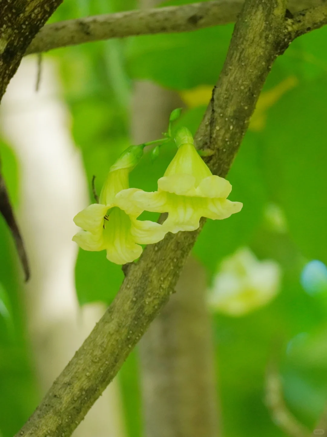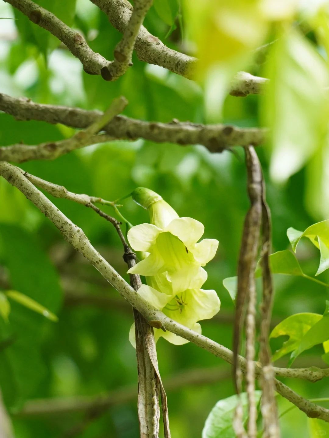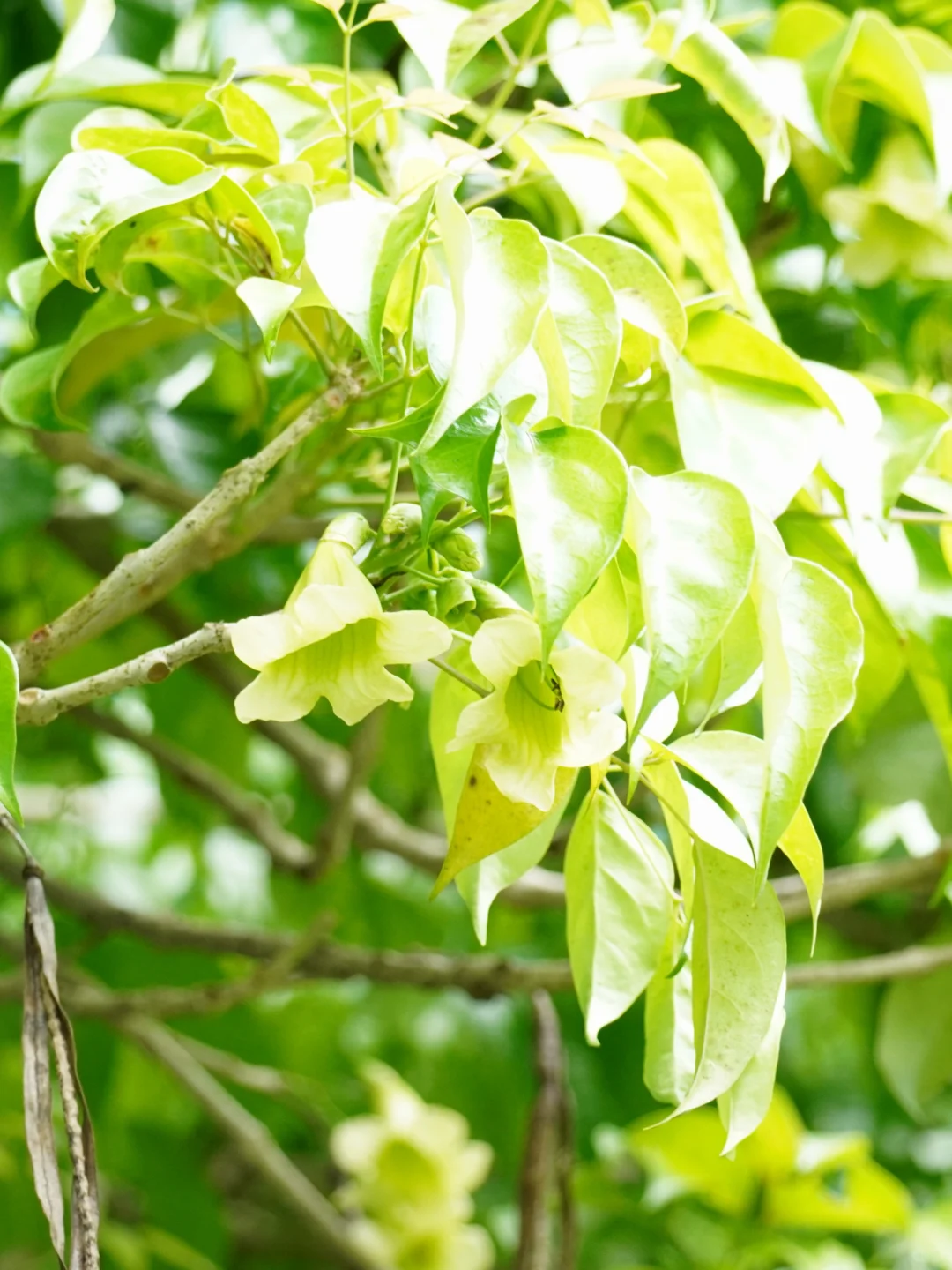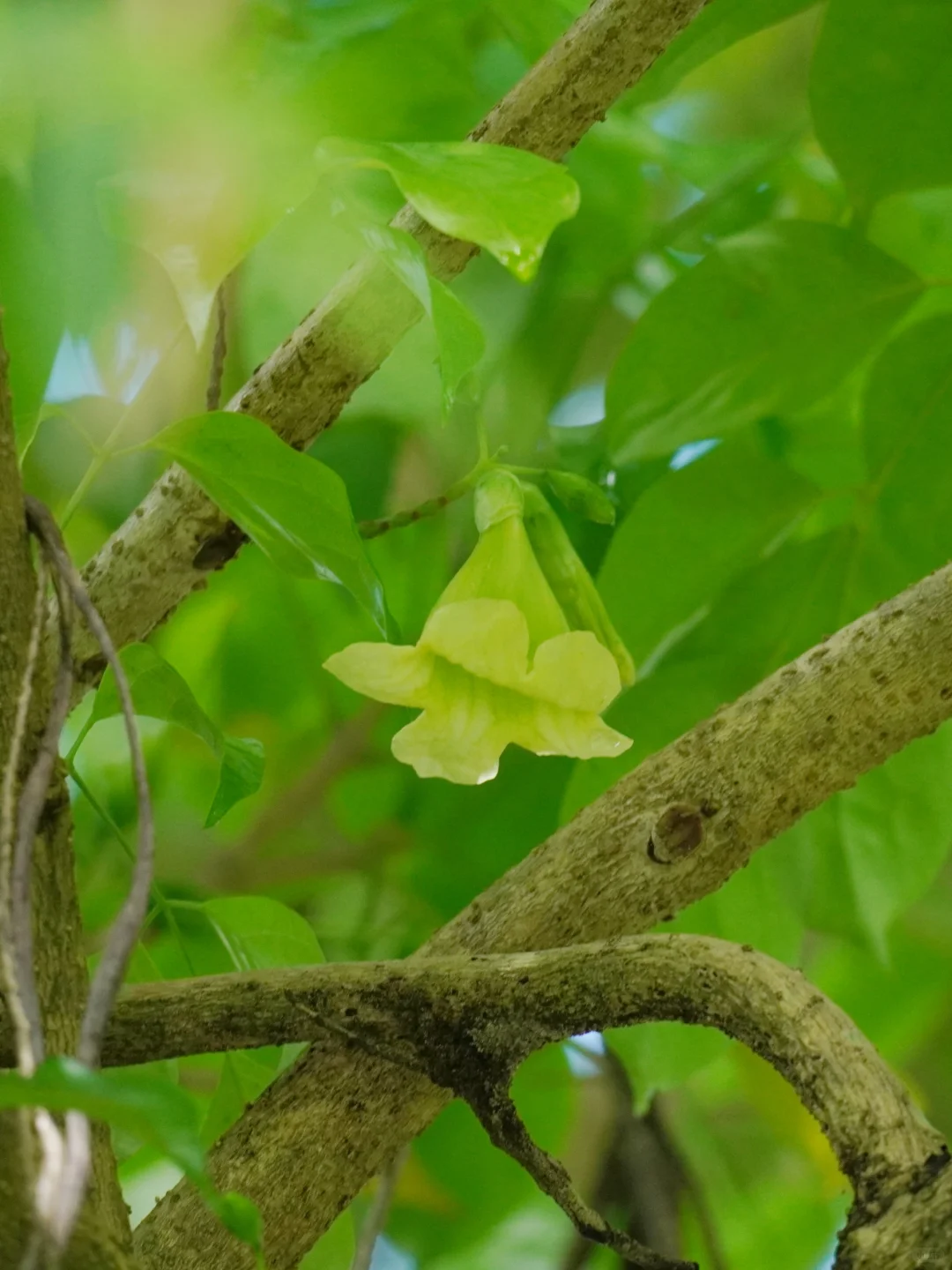 海南菜豆树的花是黄绿色的,在茂密的枝叶间很难发现花朵的踪影,一般都是看到树下的落花时,才惊觉它又到了花期。