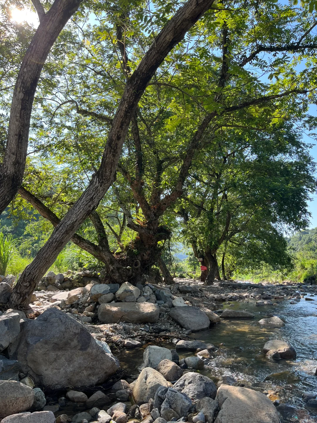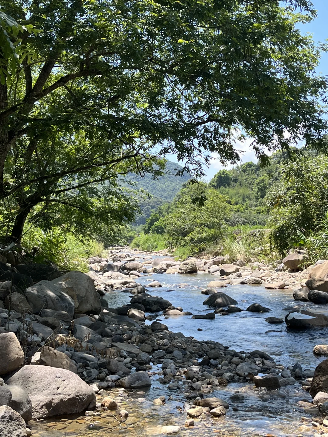 11:00返程,发现农场门口右侧还有一条小路进入溪流,水接近溪流下游,更浅,更适合低幼小朋友,并且有很多大树,遮荫效果相对更好一点。