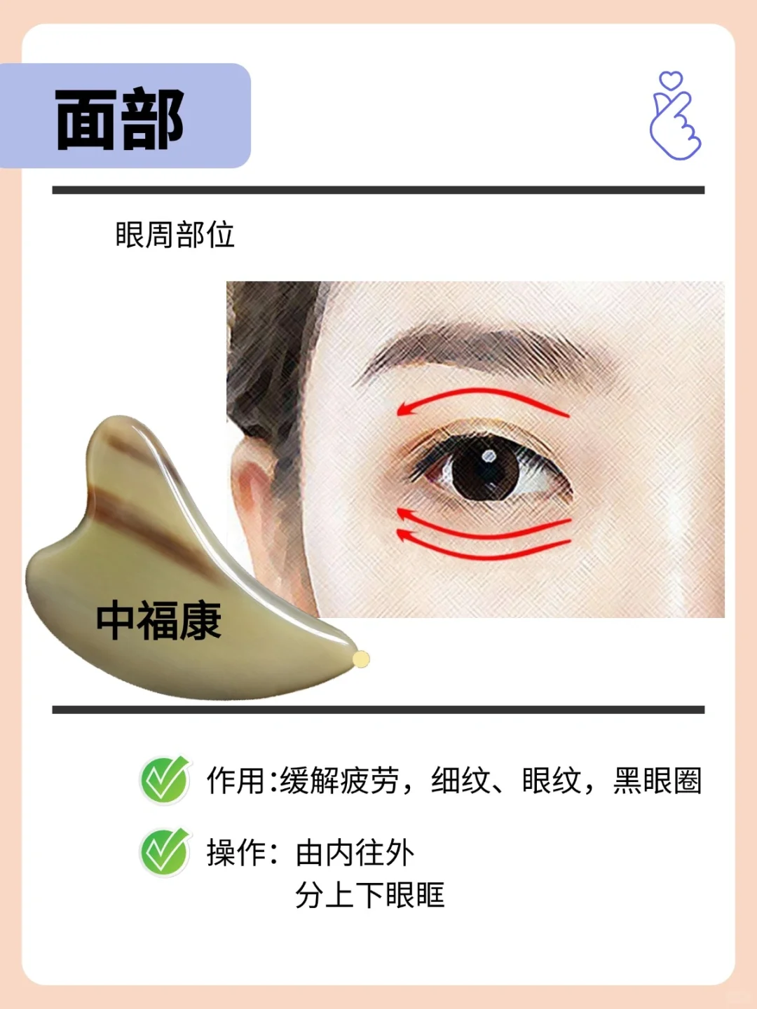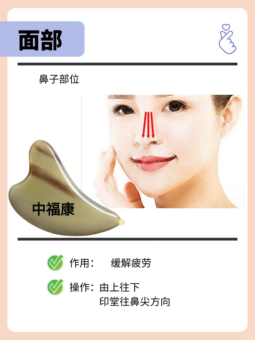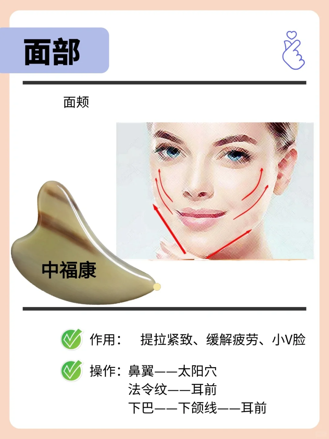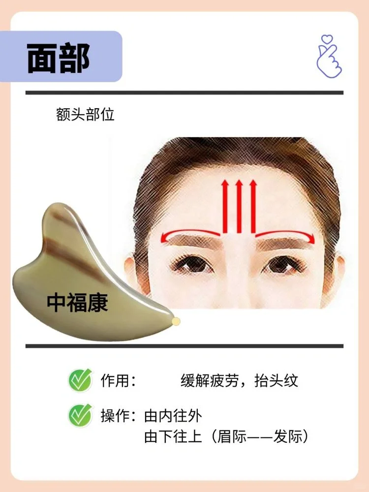 工具推 荐: 牛角刮痧板:厚0.7-1.0左右 拨筋棒:长10-13cm左右 搭配:润滑油,护肤品,更好吸收 - 步骤解析 🌸第 一步: 面部卸妆,洁面,均匀涂抹润滑油 - 🌸第 二步: 耳下淋巴,打开,往下刮10次, 颈后三角淋巴,结往下刮10次 - 🌸第三步: 假性抬头纹,用拨筋棒点按印堂穴10秒 用刮痧板内弧面刮额头,从中间往两边,从下往上刮10次,帮助改善假性抬头纹。 - 🌸第四步: 眼部水肿,眼周穴位打圈按摩(睛明、攒竹、鱼腰、太阳、承泣),上下轮刮眼眶。 固定住太阳穴,往上提拉一点,从睛明开始,到太阳穴,到耳前淋巴,10次。 - 🌸第五步: 下颌线,提拉轮廓,紧致肌肤。 用刮痧板的V槽面刮左脸的下颌缘,每边各3次, 用刮痧板内弧面,法令纹位置,到耳前,10次。 - 🌸第六步: 苹果肌,用刮痧板V槽抵住脸上苹果肌的位置上,往上提,拉到太阳穴。紧致肌肤,消水肿,瘦小脸 ,排du,注意要轻柔一点,不要出痧。 - 牛角刮痧板、拨筋棒、梳子 天然产品,任何两个都不会一样