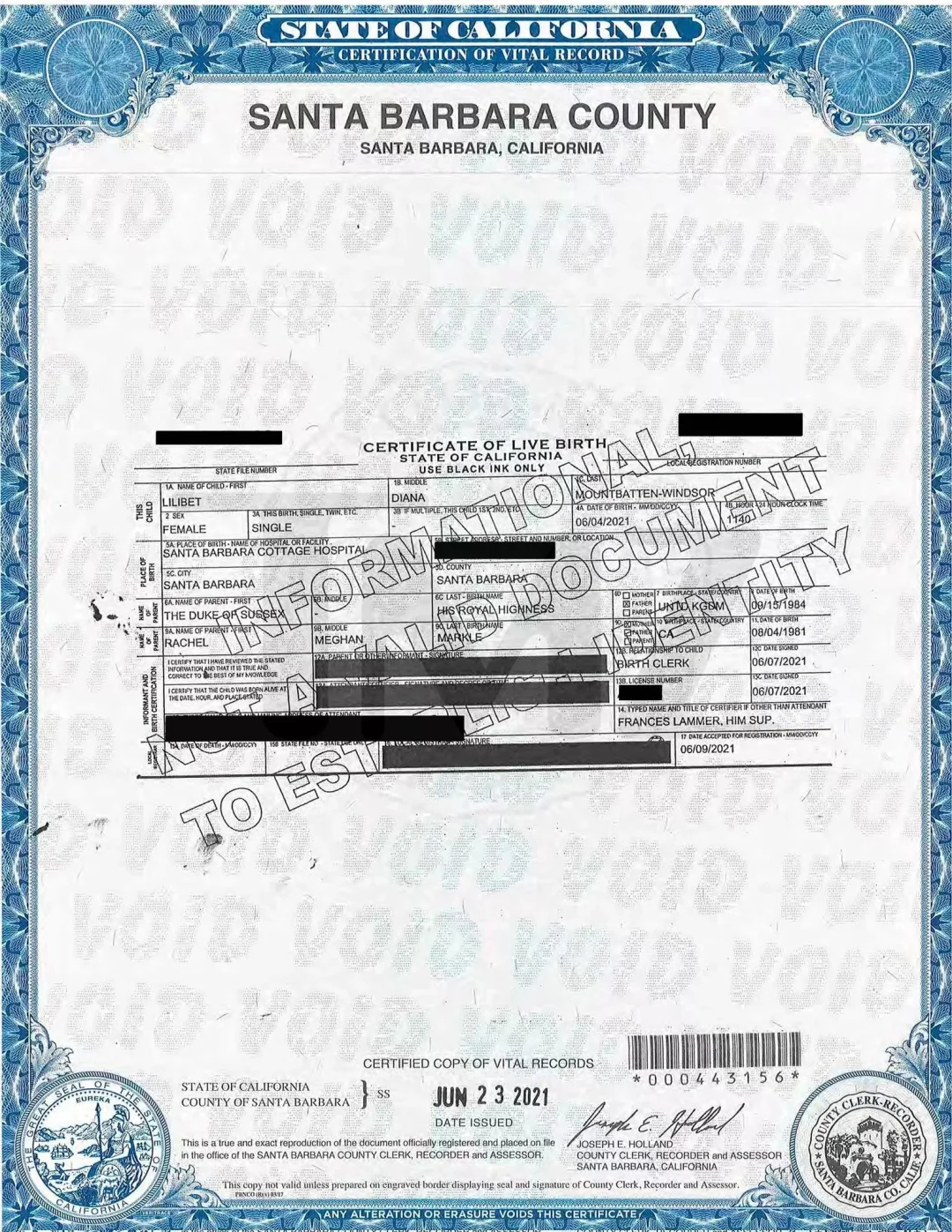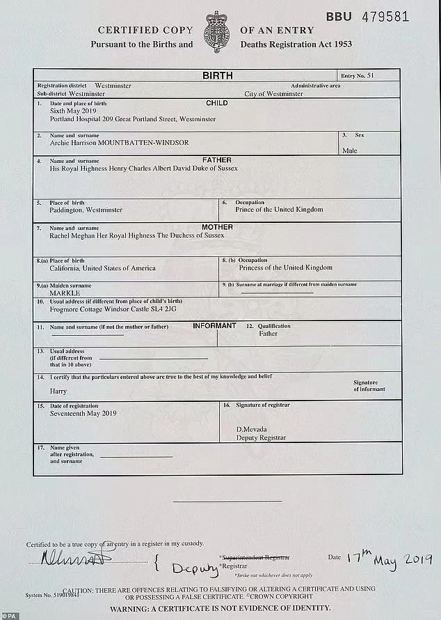 阿奇和莉莉贝特的出生证明,梅根没代孕