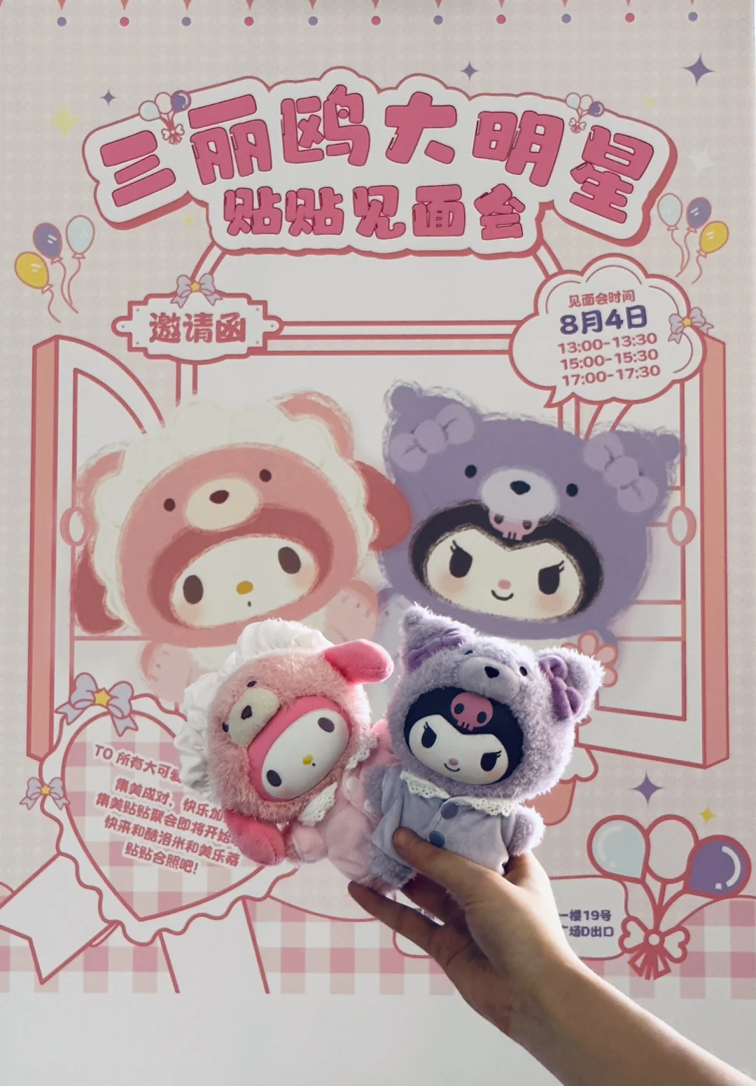 今天来深圳参加三丽鸥大明星贴贴见面会[偷笑R] 三丽鸥第一次出搪胶毛绒,现场看到实物宝宝真的很可爱[哇R] 还专门请了库洛米和美乐蒂到现场跳舞hhh[暗中观察R] 两个大明星拿着宝宝的画面不要太!有!爱!了![害羞R]