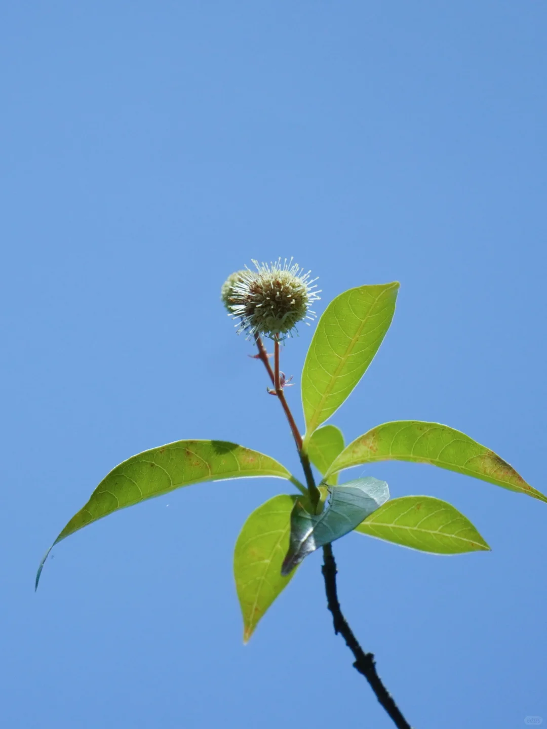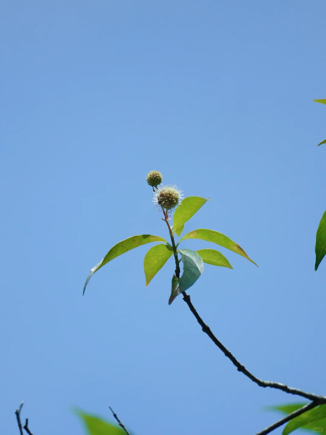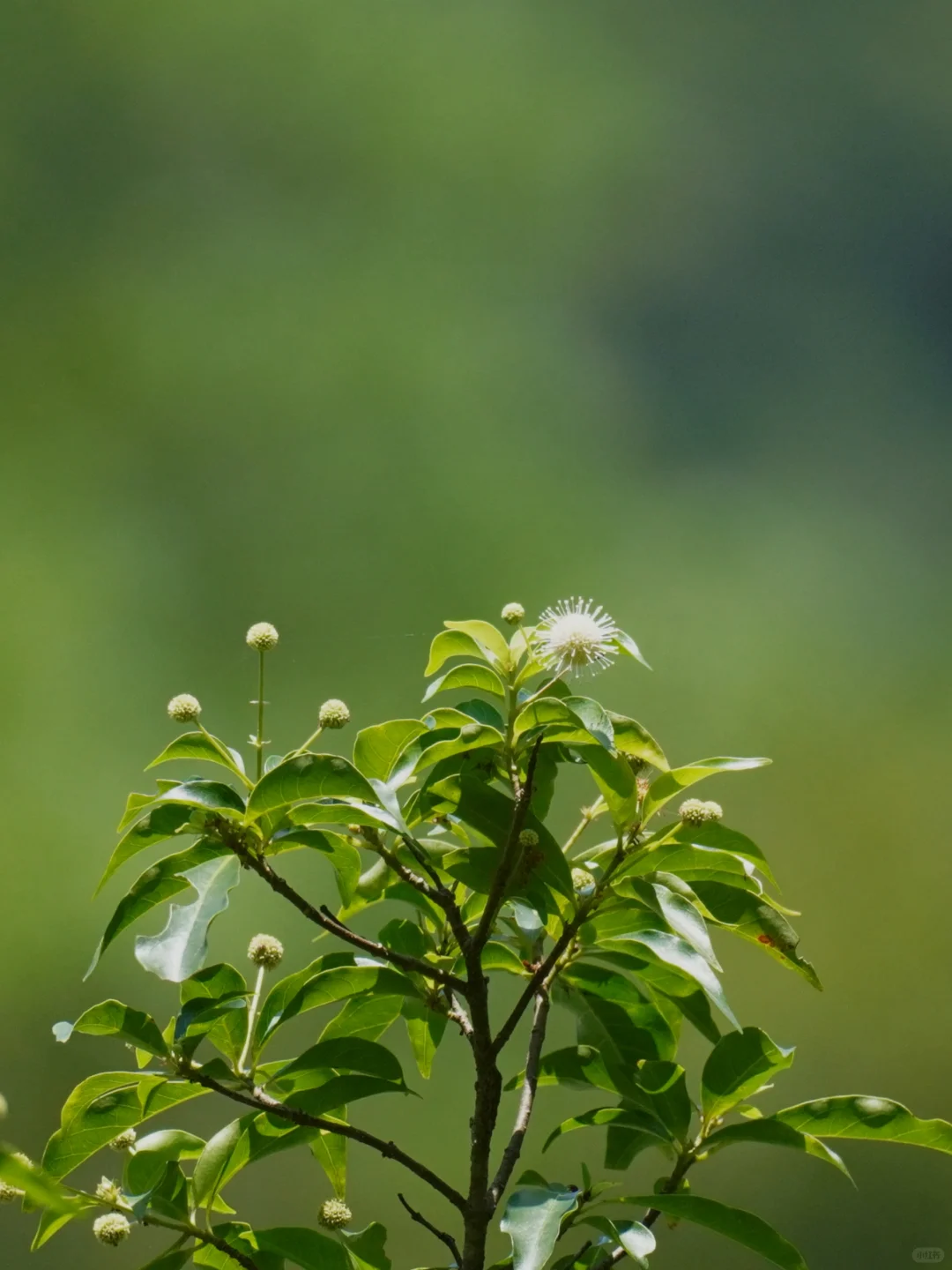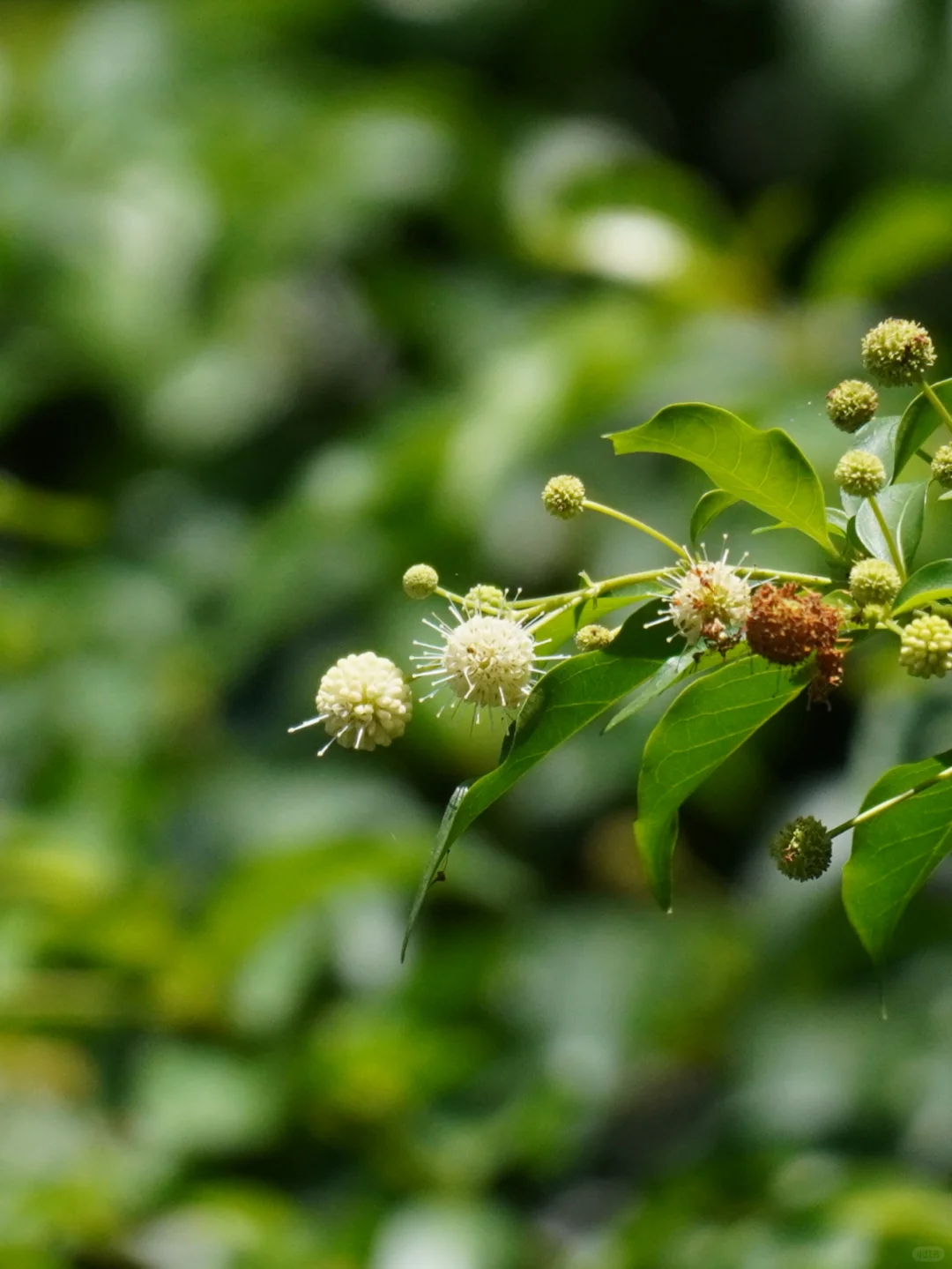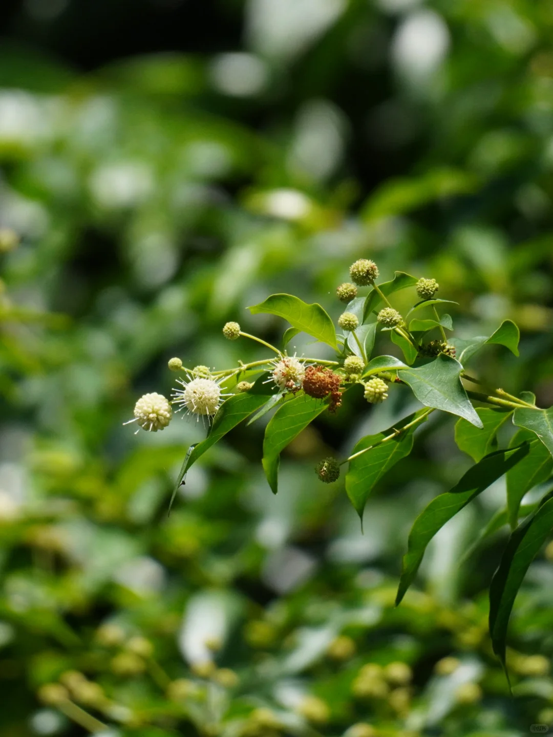 水团花的花朵像是一个个的小太阳,在前几年还被戏谑为“冠状病毒”花,它的花远看还很像是一颗颗的白杨梅,所以它又被称为水杨梅。
