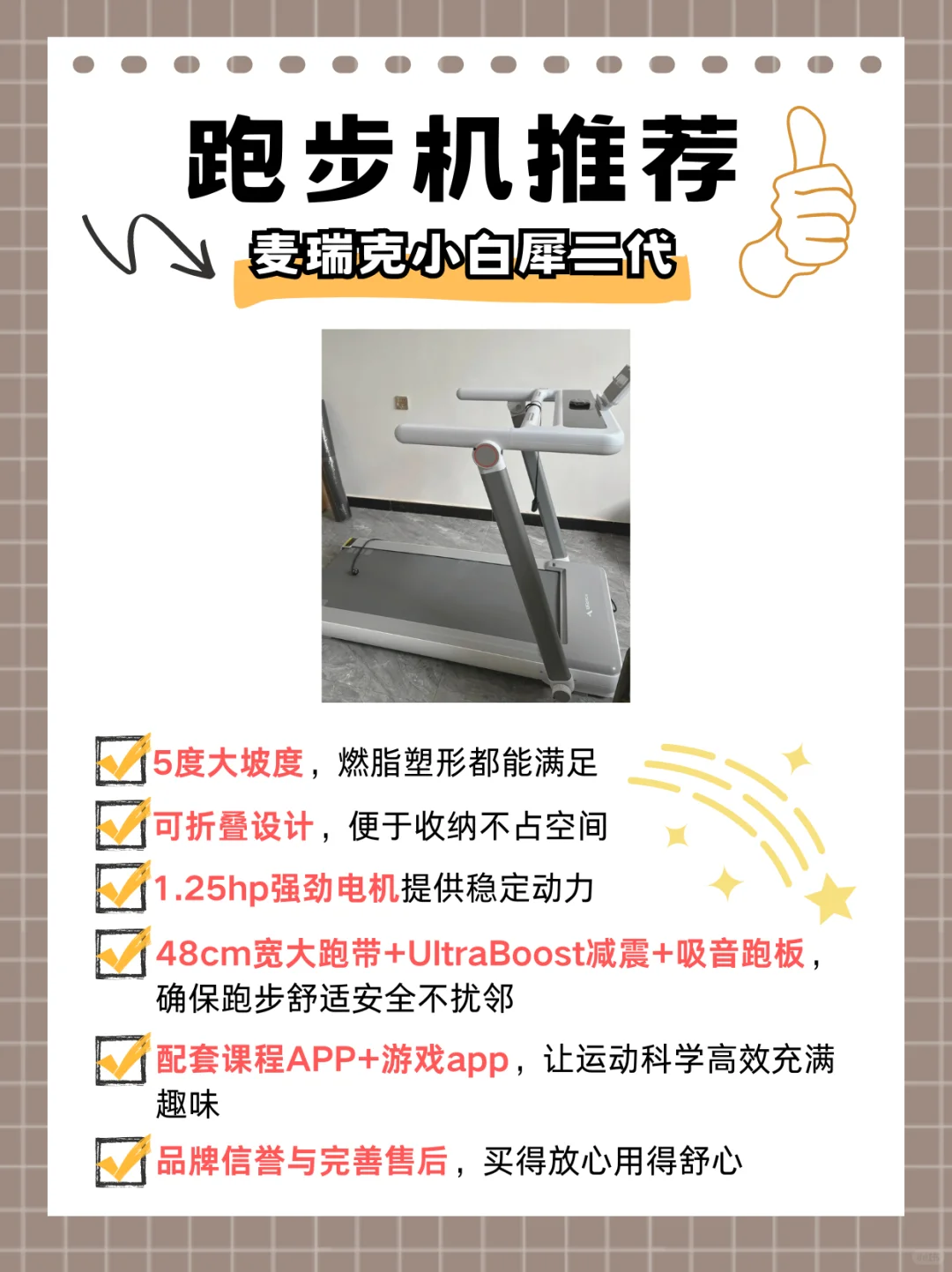 ✅综合以上几点,我们不得不提到这款👉🏻麦瑞克跑步机小白犀2代。这款跑步机不仅价格亲民,符合入门及基础健身需求,更在多个方面表现出色: