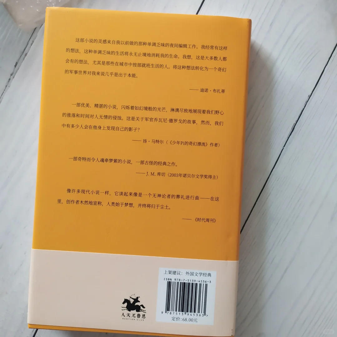 迪诺·布扎蒂二十世纪意大利著名作家。他被誉为“意大利的卡夫卡”。这本《鞑靼人沙漠》是他享誉国际的代表作。入选了博尔赫斯的《私人藏书》。诺贝尔文学奖库切地《等待野蛮人》的灵感也来源于它。