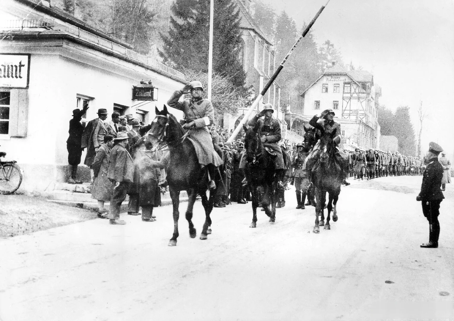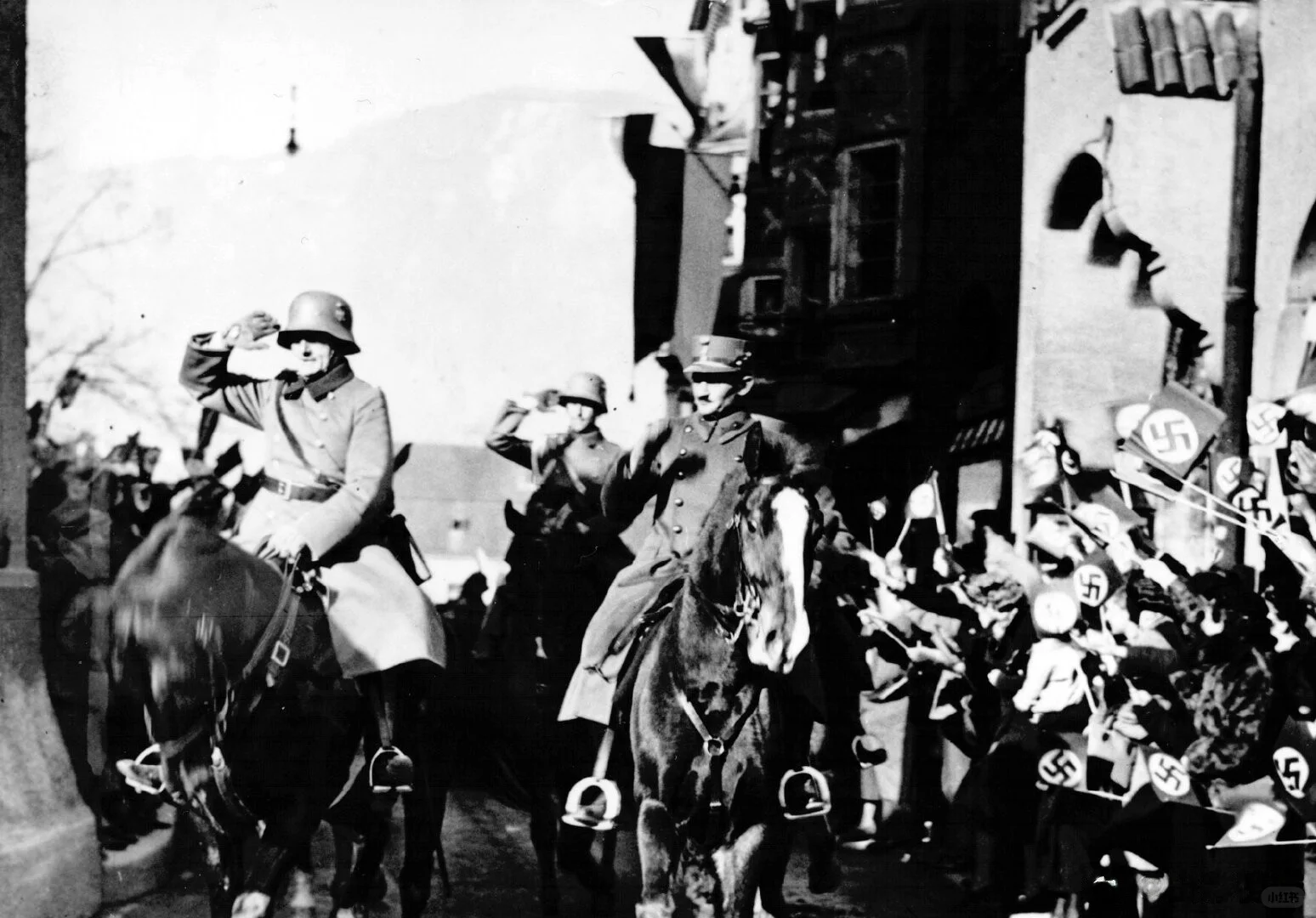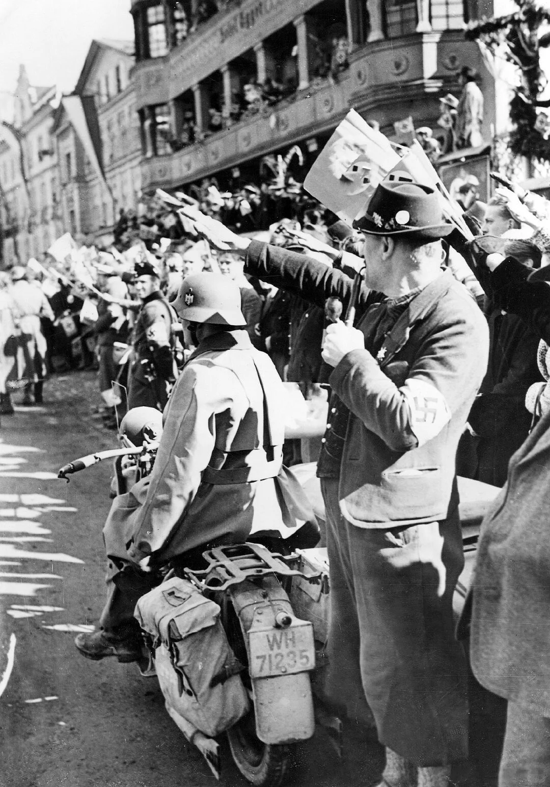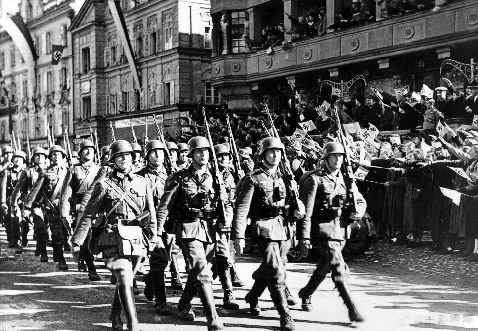 3 月 12 日,纳c党徒制造借口,德国军队长驱直入奥地利。13 日,小胡子抵达维也纳,签署德奥合并法律,奥地利成为德国东方省。