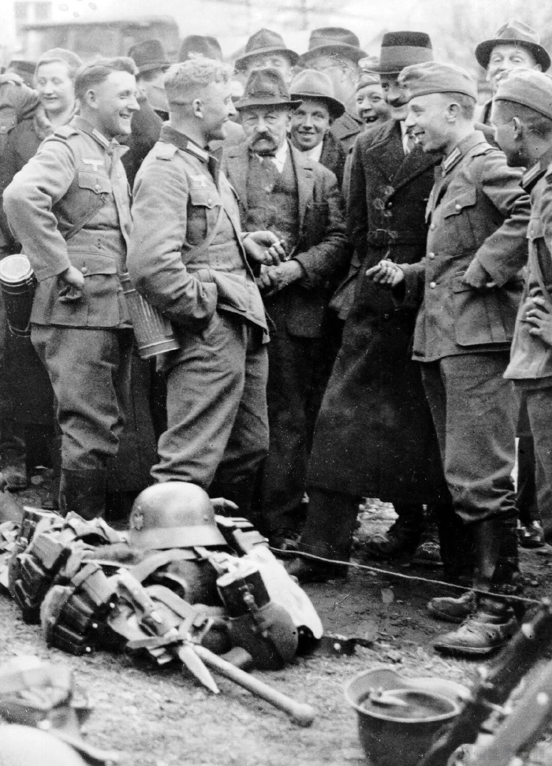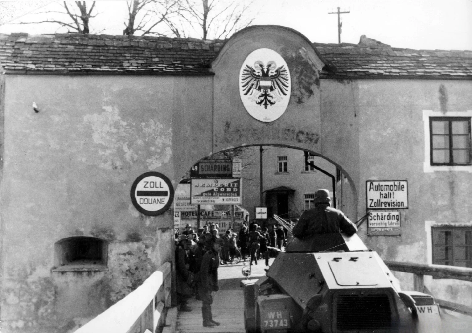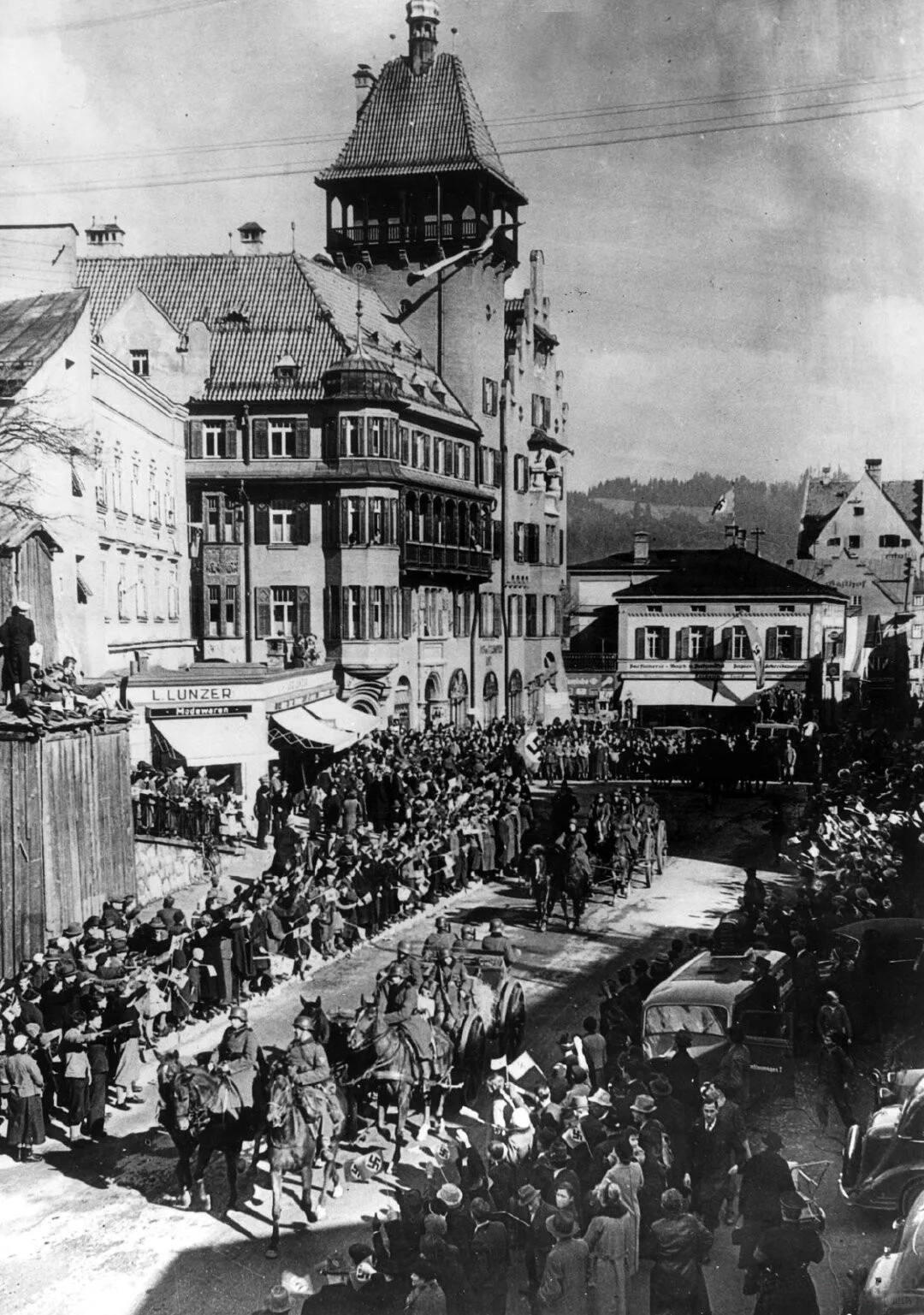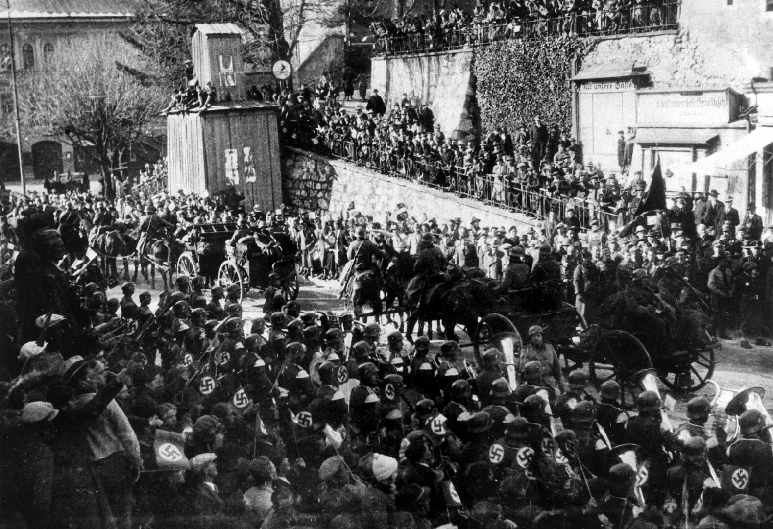 3 月 12 日,纳c党徒制造借口,德国军队长驱直入奥地利。13 日,小胡子抵达维也纳,签署德奥合并法律,奥地利成为德国东方省。