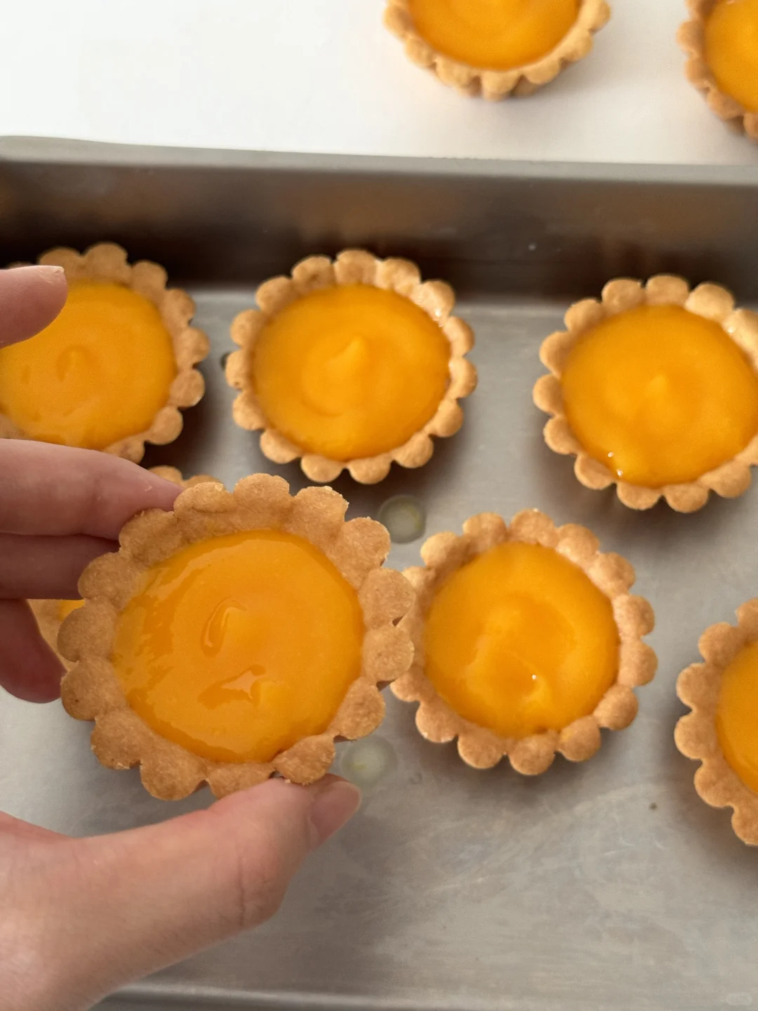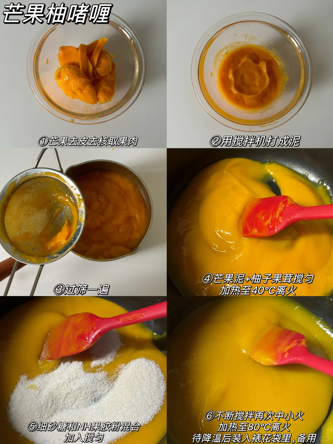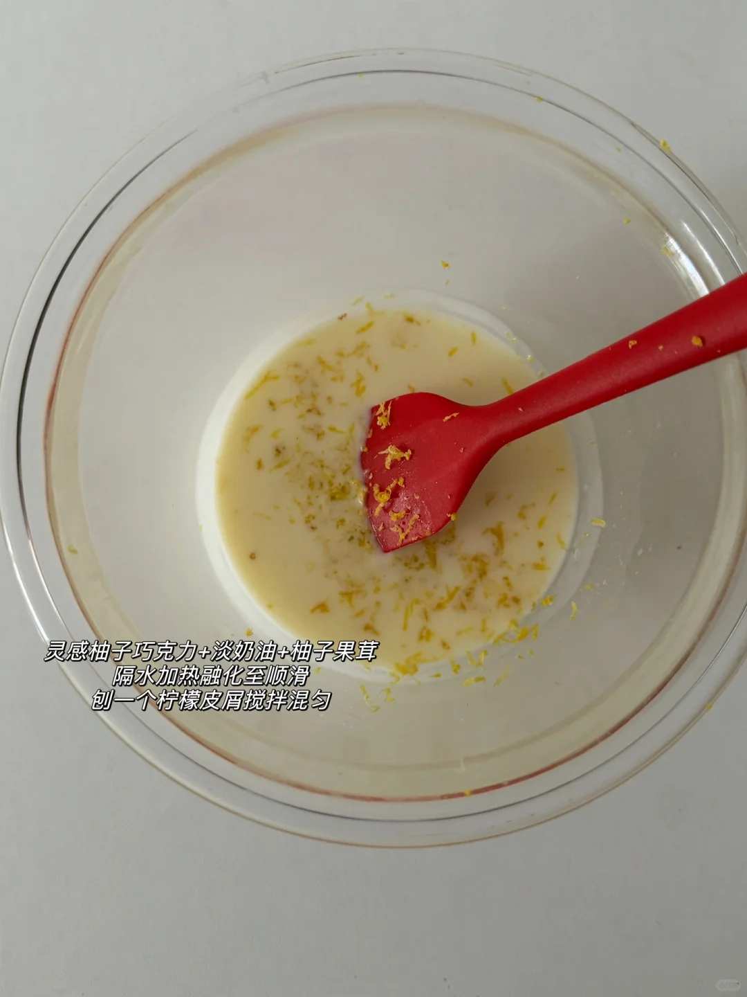 一个属于夏日的甜香清新挞。 芒果的香甜、柚子的清新与柠檬的酸香。 顶部是芒果柚子啫喱,中间是柚子柠檬馅,杏仁挞皮。 [挞皮]能做9-10个 黄油48g 糖粉20g 低筋面粉80g 杏仁粉12g 盐0.5g 全蛋液15g [柚子柠檬馅] 柚子果茸4g 灵感柚子巧克力 24g 淡奶油90g 柠檬皮适量 [芒果柚子啫喱] 芒果肉100g 柚子果茸8g 糖20g Nh果胶2.5g · 挞里倒入柚子柠檬馅,放冰箱冷冻半小时 接着再挤入芒果柚子啫喱,再放冰箱冷藏2小时