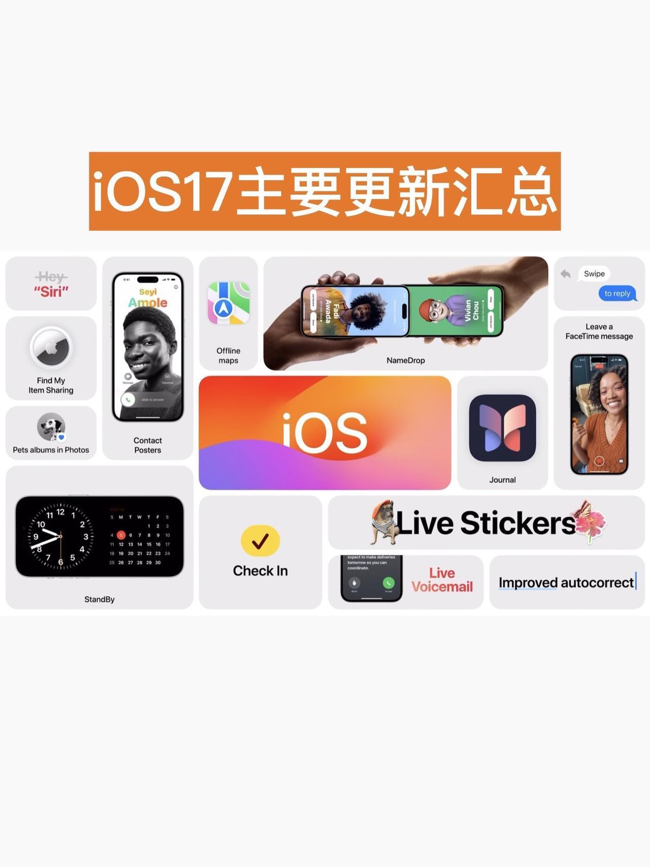1、电话:自定义来电显示,图像和文本组合,类似于锁屏壁纸的设定; 语音留言,可以自动转换为文本; 2、短信:新增短信贴纸,可以将照片、表情包存储为贴纸; 新增到家安全确认通知功能; 3、隔空投送升级: 基于NFC,iPhone之间碰一碰,即可互传名片、联系方式; 传送大文件,离开投送距离,也会通过网络继续传送,也支持同播共享投送功能; 4、Siri升级:唤醒词简化,喊“Siri”,可以直接唤醒,并且可以连续对话、提问; 5、新增APP: Journal 可以创建回忆录,会根据最近记录内容,提供内容建议,让创作更省事; 6、新增待机功能:有多种主题样式,横屏显示;也可以用作床头钟,也会根据周围环境亮度,自动调节时钟的显示效果; 7、优化键盘输入:输入更精准,自动纠正、预测;听写输入效率更高; 支持机型:iPhoneXR及以后机型 iPhoneSE二代、三代ios17 iphone