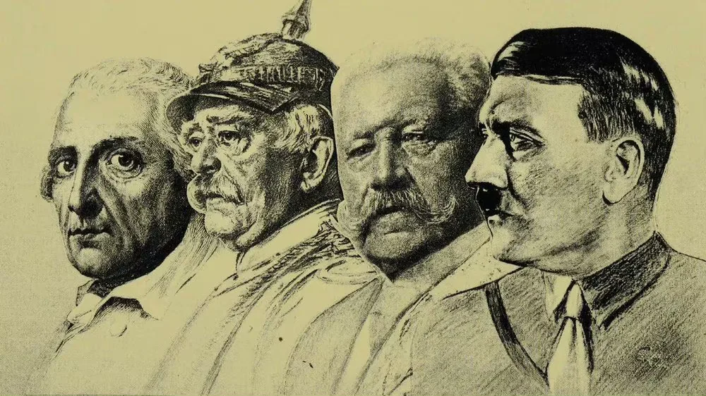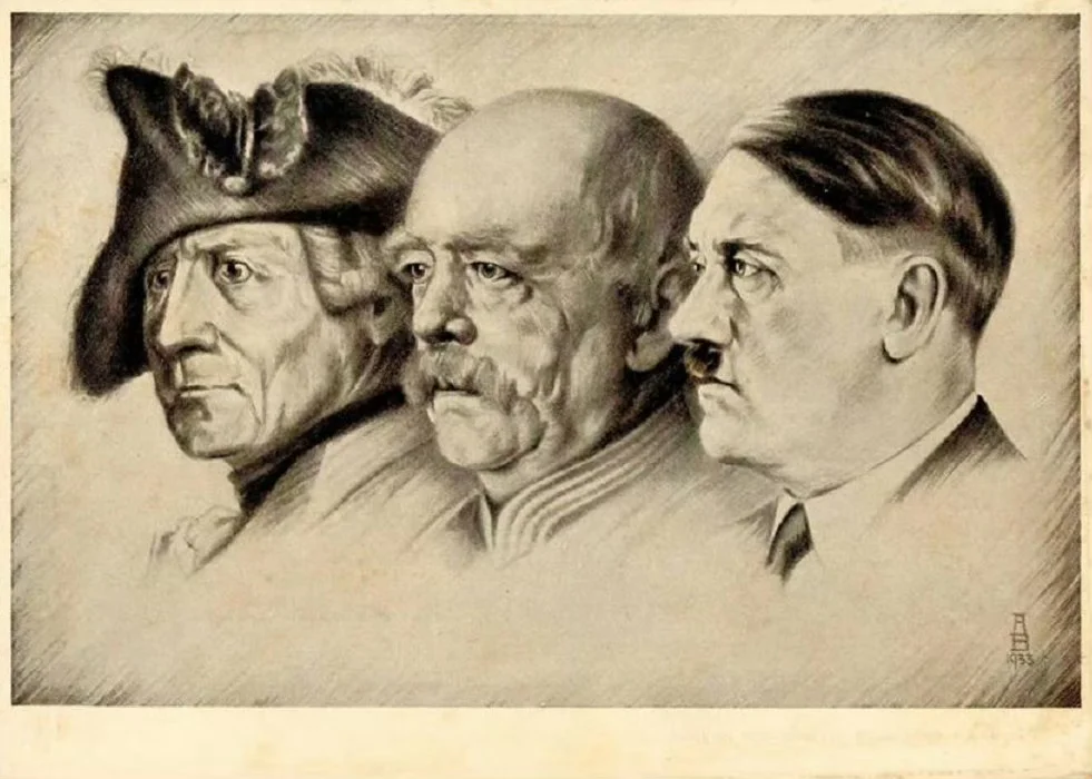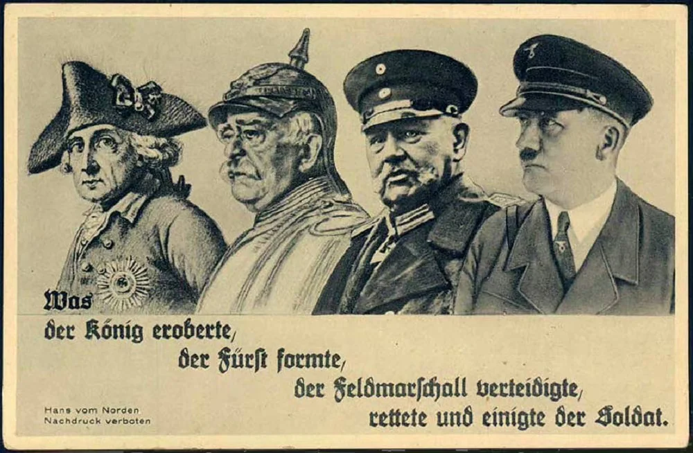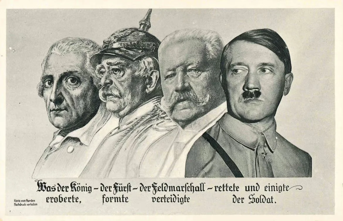 “国王征服于斯,亲王建立于斯,元帅保卫于斯,士兵拯救和团结于斯” 1933年纳c明信片上,小胡子与腓特烈大帝、俾斯麦和兴登堡并肩作战