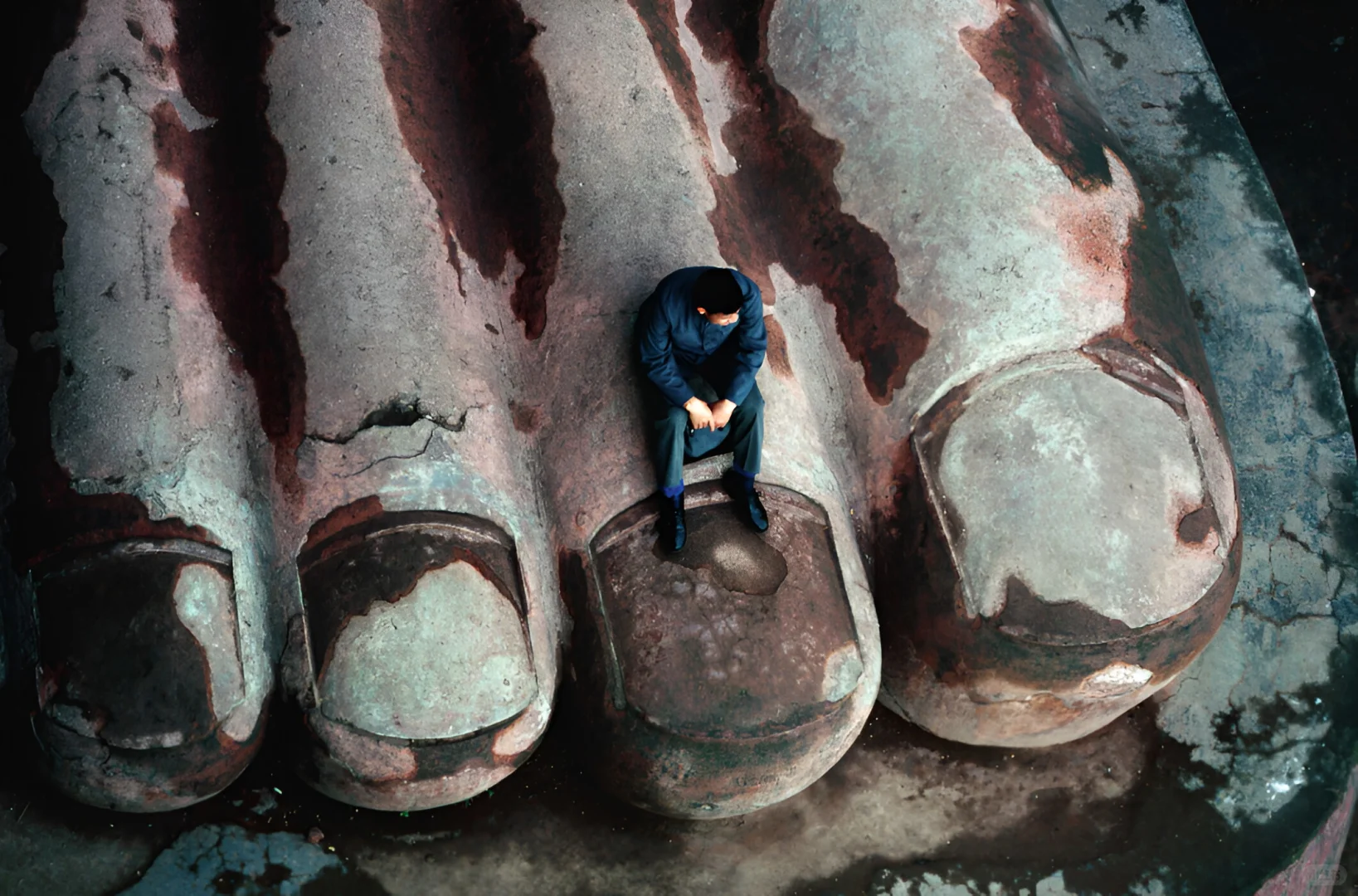 图8:1980年,乐山,一位男士坐在乐山大佛的脚趾上