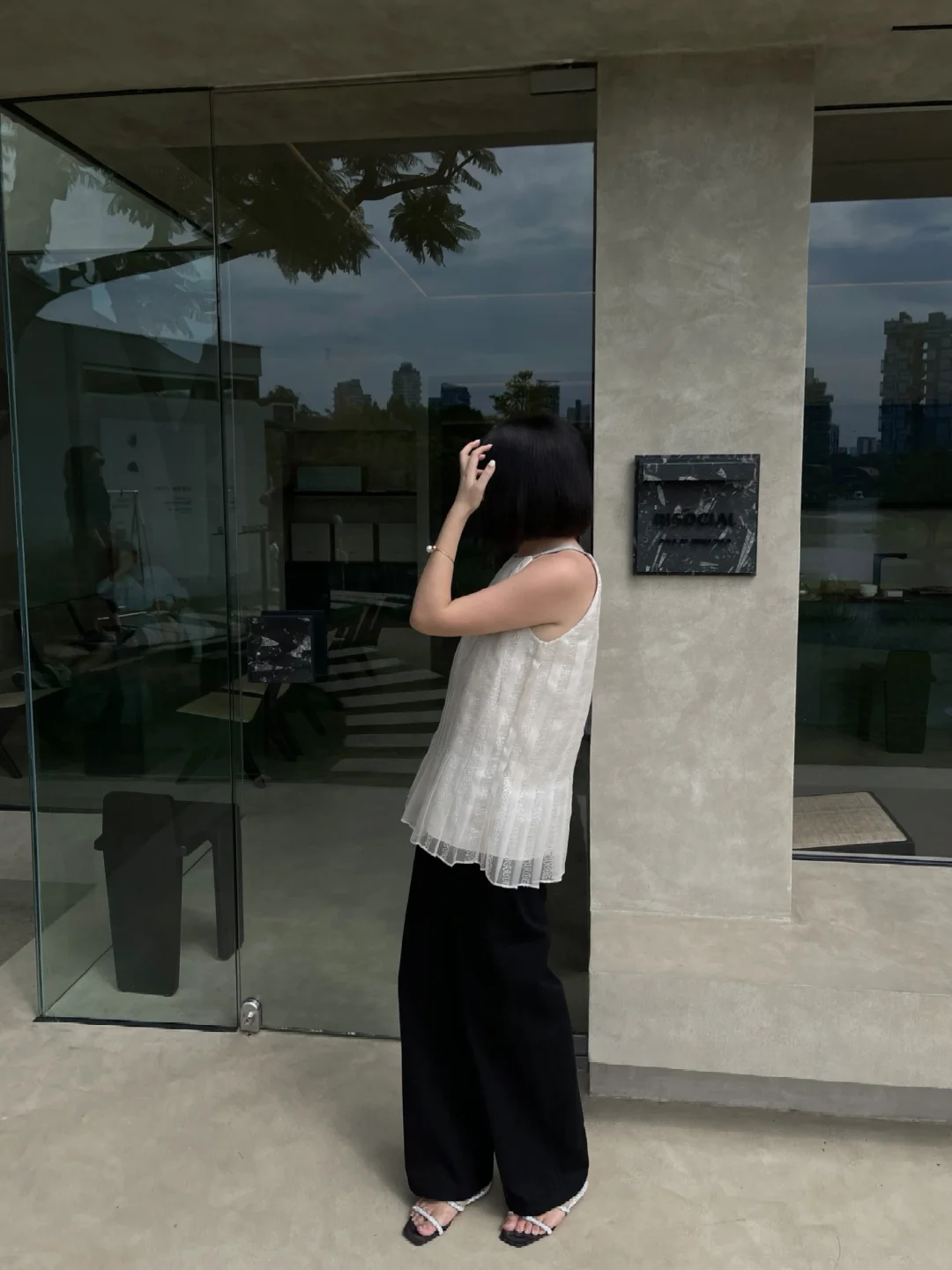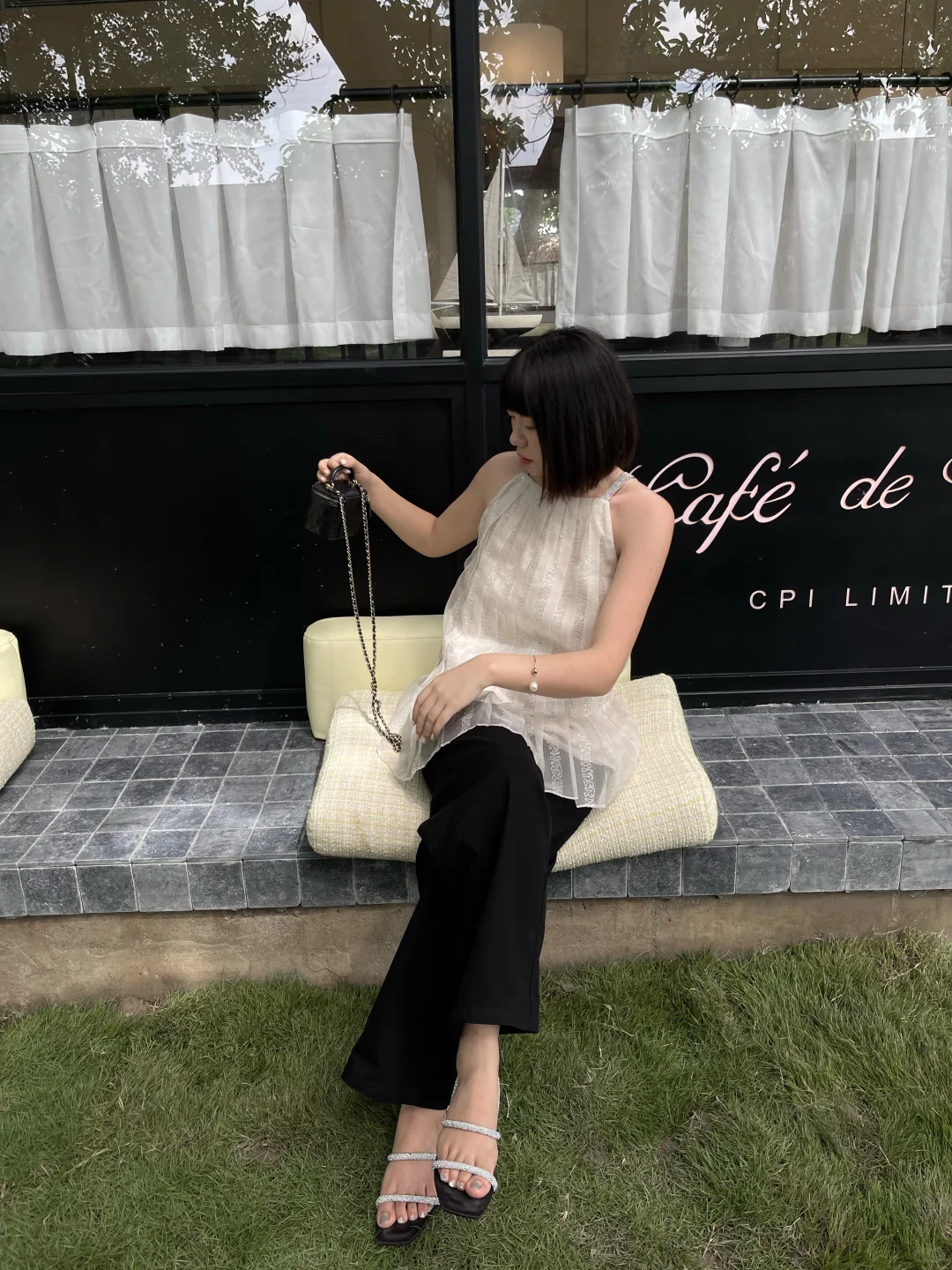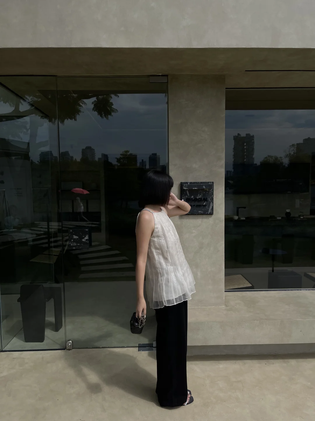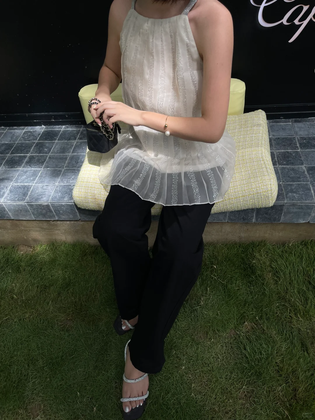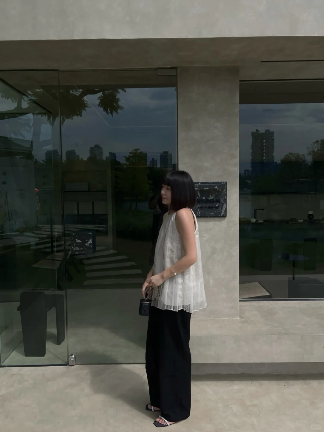 少女清新穿搭,黄色吊带裙搭配米色长裤,轻松惬意。