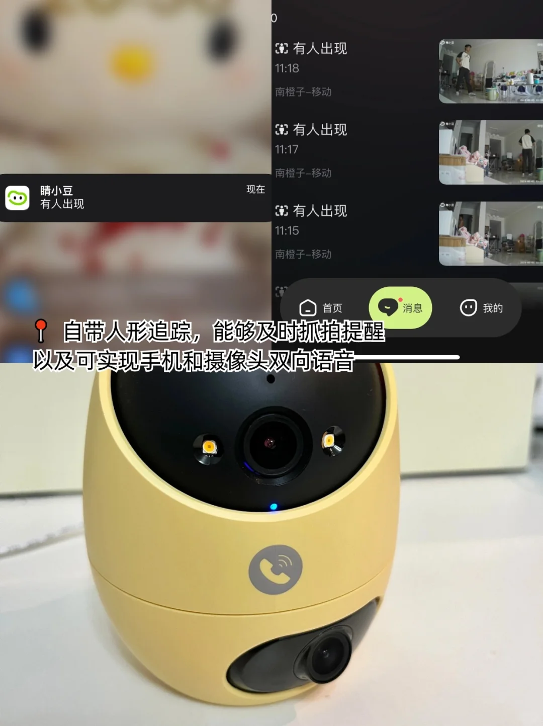 自带人形追踪功能,人走到哪指到哪,实时提醒,安全感爆满~摄像机还有呼叫按键,轻轻一按就可实现双向通话很方便!很适合家里有老人小孩/宠物的朋友!功能很齐全,满足了家用大部分需求~