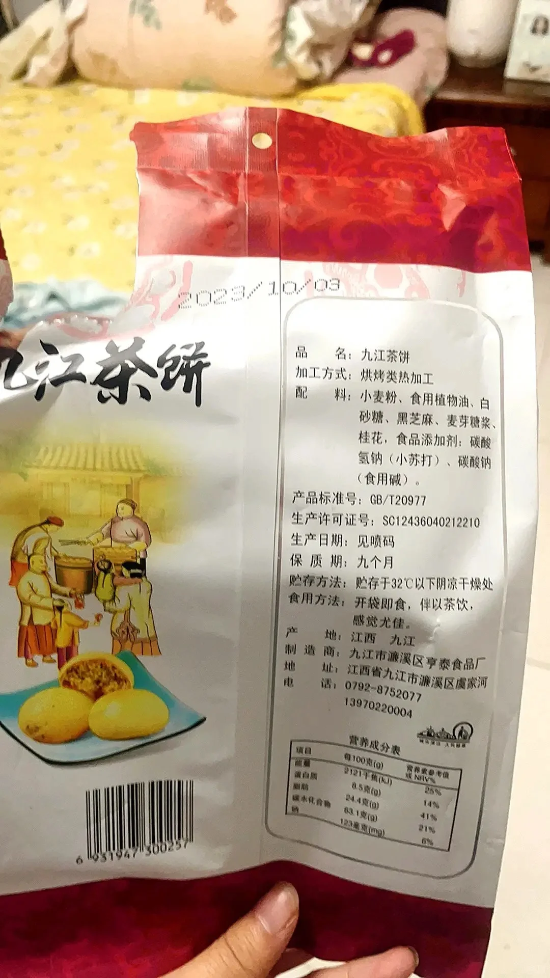 江西九江茶饼[黄金薯R],今天是一期来自江西九江特产哦~ [种草R]健康指数:🌟🌟🌟🌟🌟 配料表有:小麦粉、食用植物油、白砂糖、黑芝麻、麦芽糖浆、桂花,碳酸氢钠(小苏打)、碳酸钠(食用碱)。还是比较干净的~ [种草R]性价比:🌟🌟🌟🌟🌟🌟2袋/18.2r 分量还是比较足的,比较划算,有板栗,奶香,椒盐,桂花等口味 [种草R]口感:🌟🌟🌟🌟🌟 从小到大从来没有听过这个零食,要不是去江西玩儿根本不会知道,还有这么好吃的糕点啊!!被丑包装耽误的九江茶饼,怎么没有人告诉我啊!!
