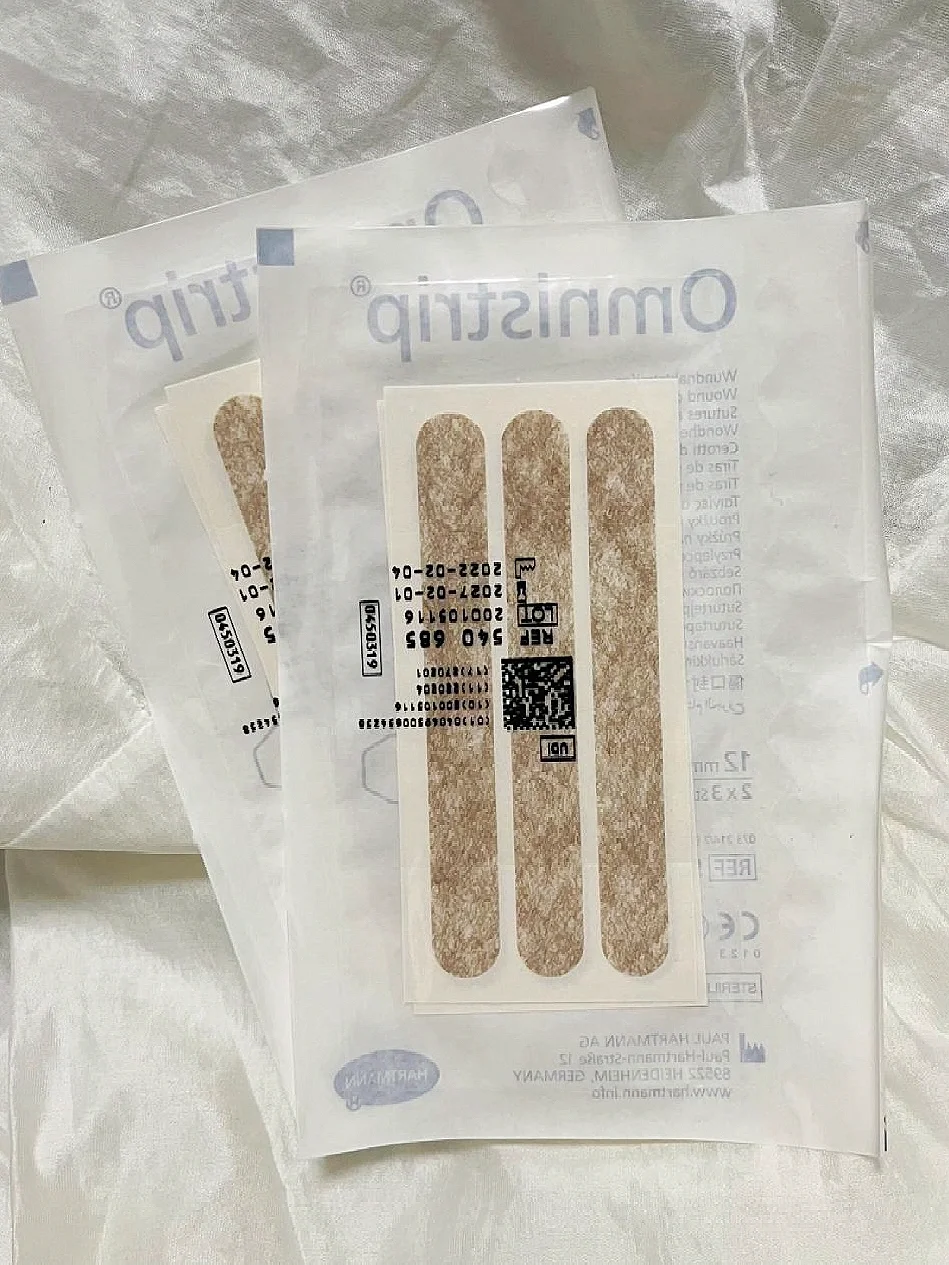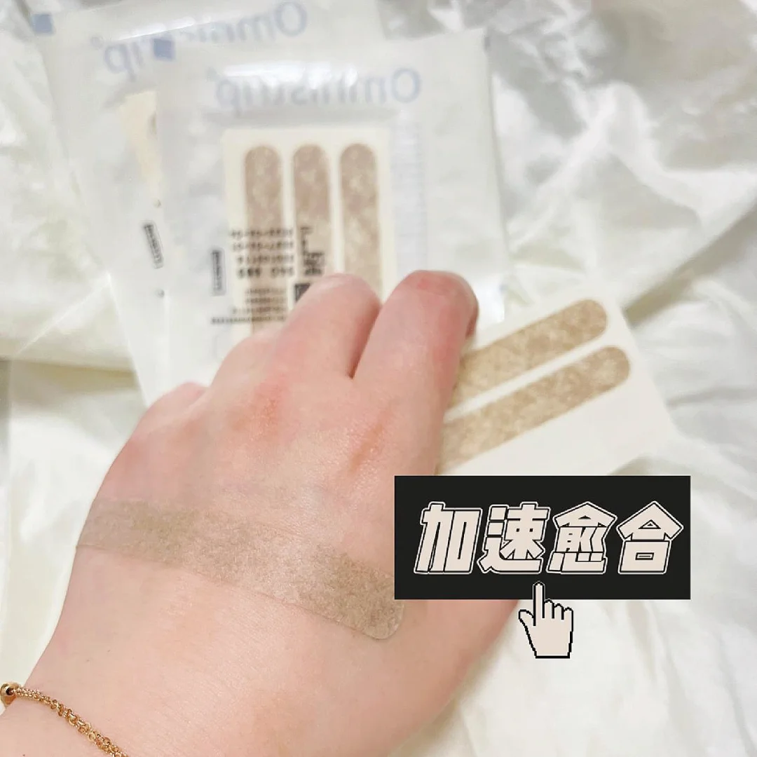 ✔️浅肤色的无纺布制成的,粘性很强,根本不需要担心会脱落。而且还特别的透气,不闷不厚重。德免减张贴怎么用呢,其实很简单,根据自己的伤口大小裁剪合适的尺寸,排列 垂直 贴在伤口处就可以了