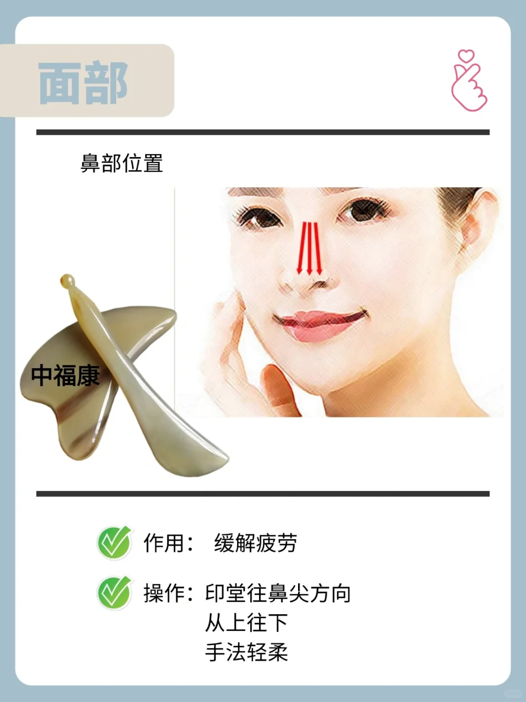5、刮痧板的大头和小头,大头能按摩面部的淋巴,提升紧致面部轮廓,小头可以用来点压穴位,放松肌肤。