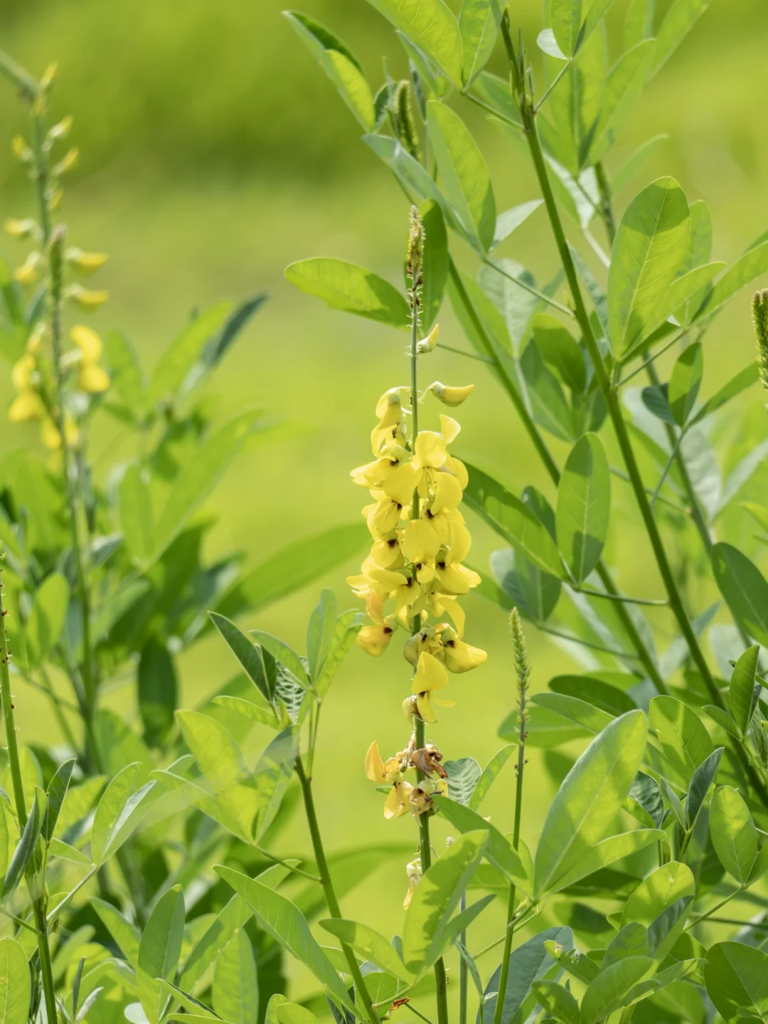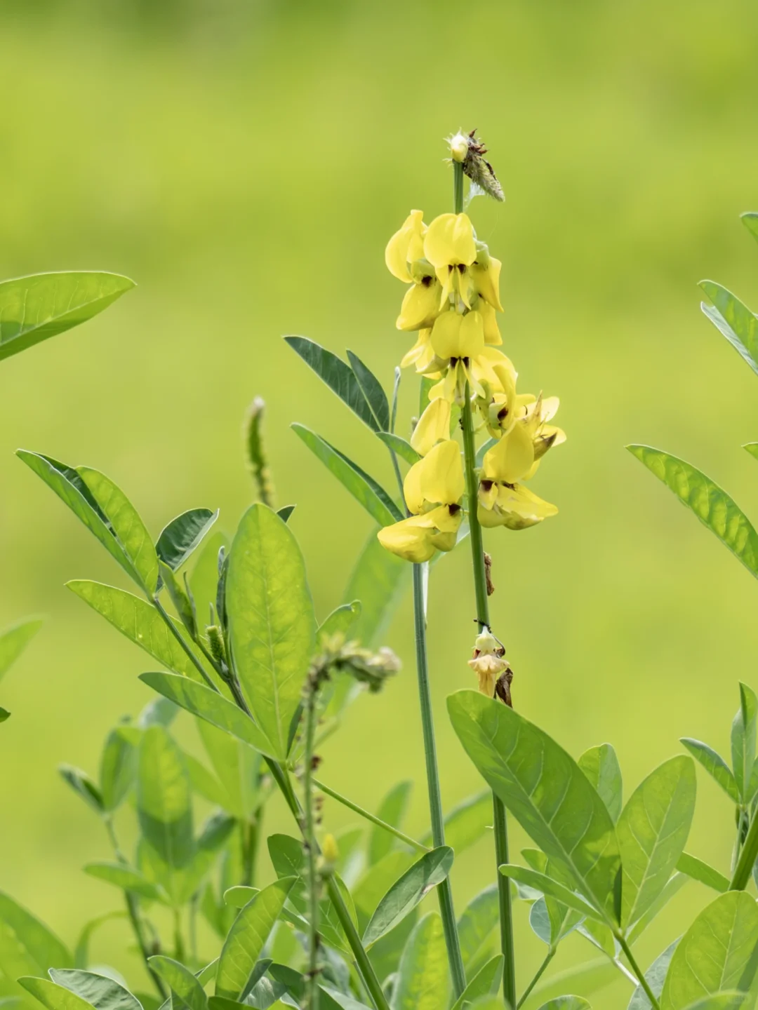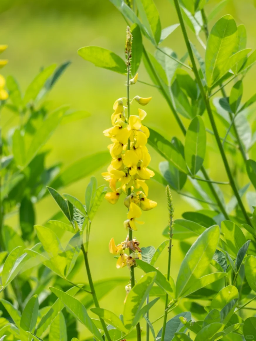 花: 总状花序顶生,有10-20花,花序长达20厘米;苞片线形,长2-3毫米;花梗长3-6毫米,屈曲向下,结果时下垂;小苞片与苞片同形,生花梗中部以上;花萼近钟形,长4-5毫米,5裂,约与萼筒等长,无毛;花冠黄色,伸出萼外,长0.8-1厘米,旗瓣圆形,长约1.2厘米,先端具芒尖,翼瓣长圆形,约与旗瓣等长,龙骨瓣长约1.5厘米,稍弯曲,中部以上变窄,形成长喙,基部边缘具微柔毛;子房无柄;