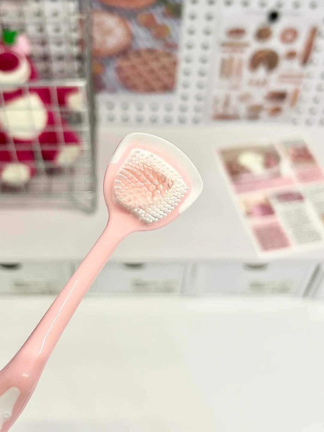 湿润舌苔后用刷毛面从内往外清刷舌头表面
