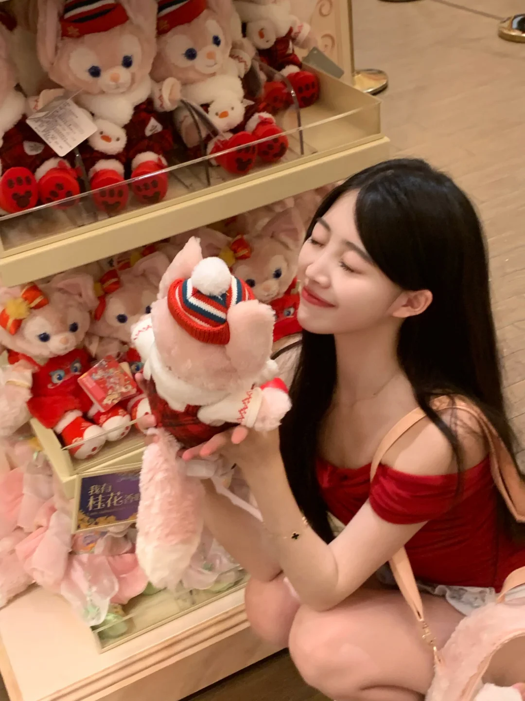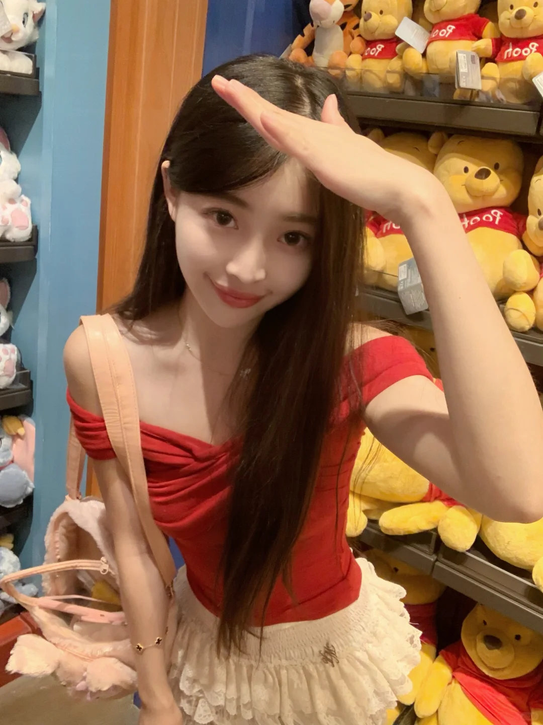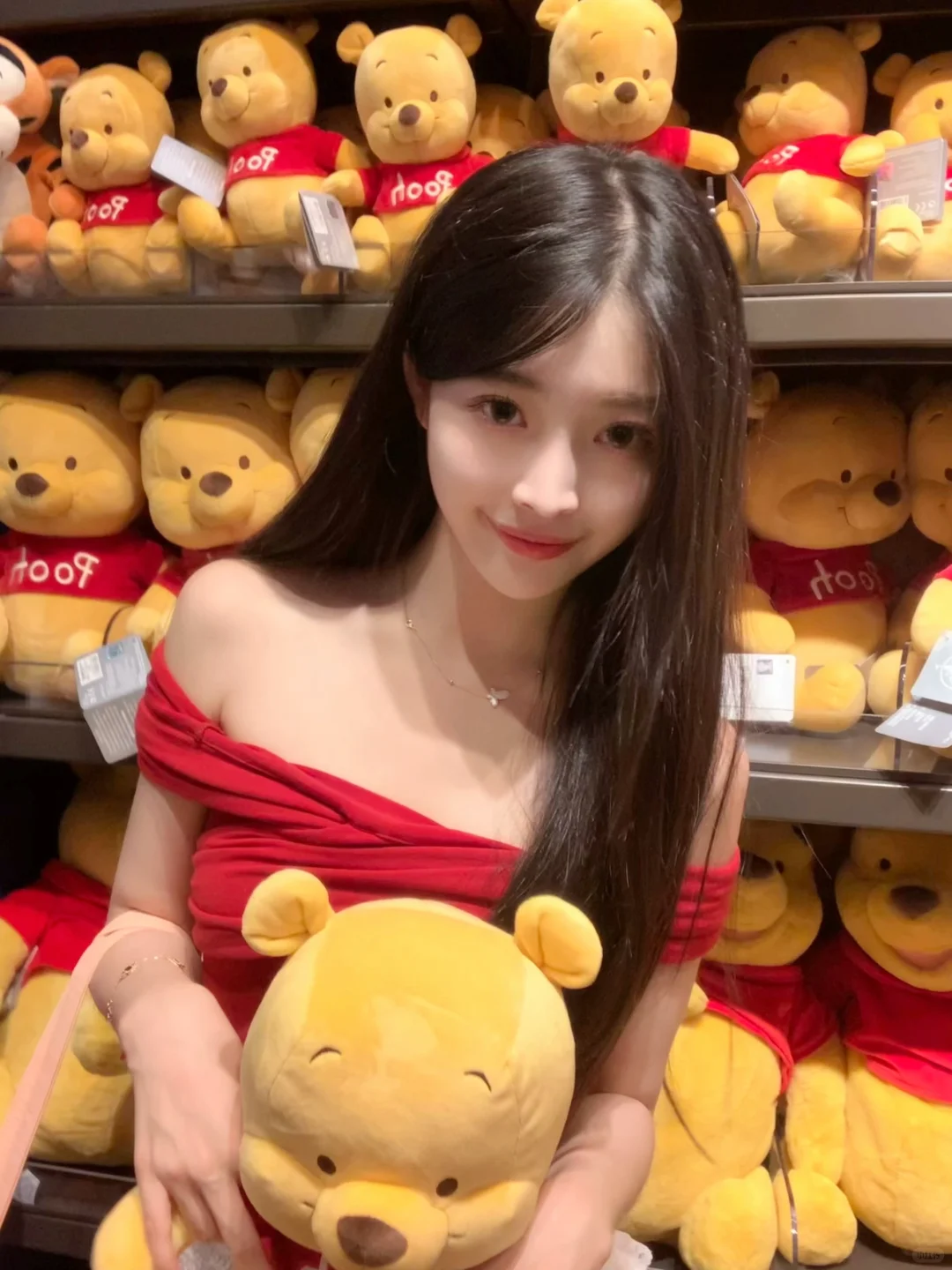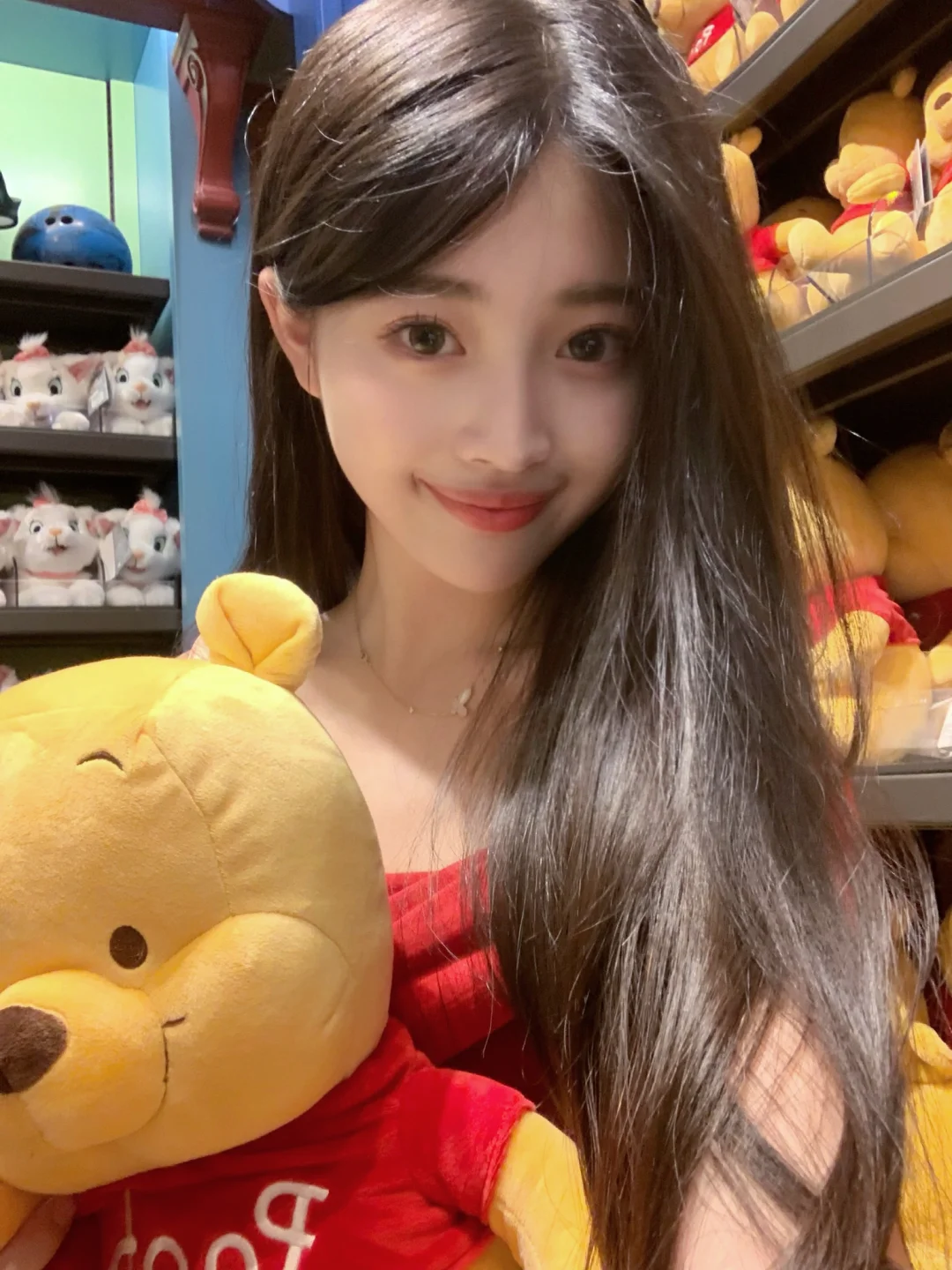 在迪士尼商店也狂拍照!🥰 红上衣和小熊维尼好适配!