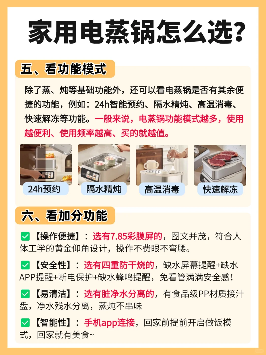 除了蒸、炖等基础功能外,还可以看电蒸锅是否有其余便捷的功能,例如👉🏻24h智能预约、隔水精炖、高温消毒、快速解冻等功能。