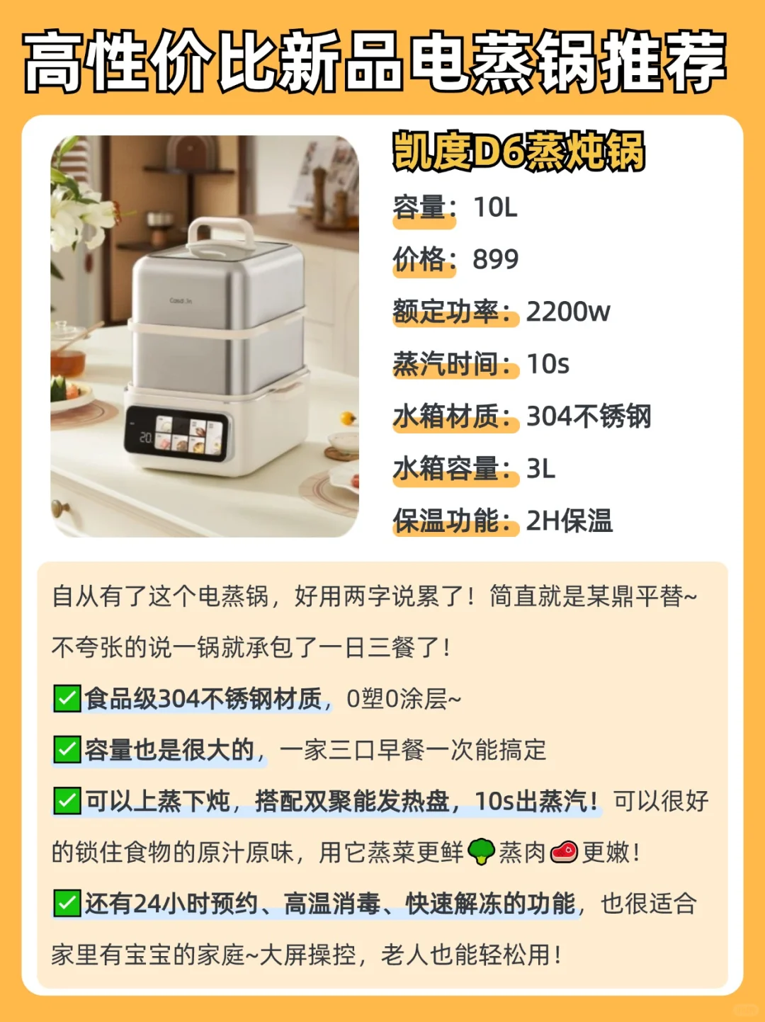 🙋🏻♀️自用推荐在最后哦~🔗凯度D6蒸炖锅对我来说使用率还是蛮高的!主要是蒸出来的食物🥘吃起来真的鲜~而且方便又快速!!!详情可以看我后面的总结呦~