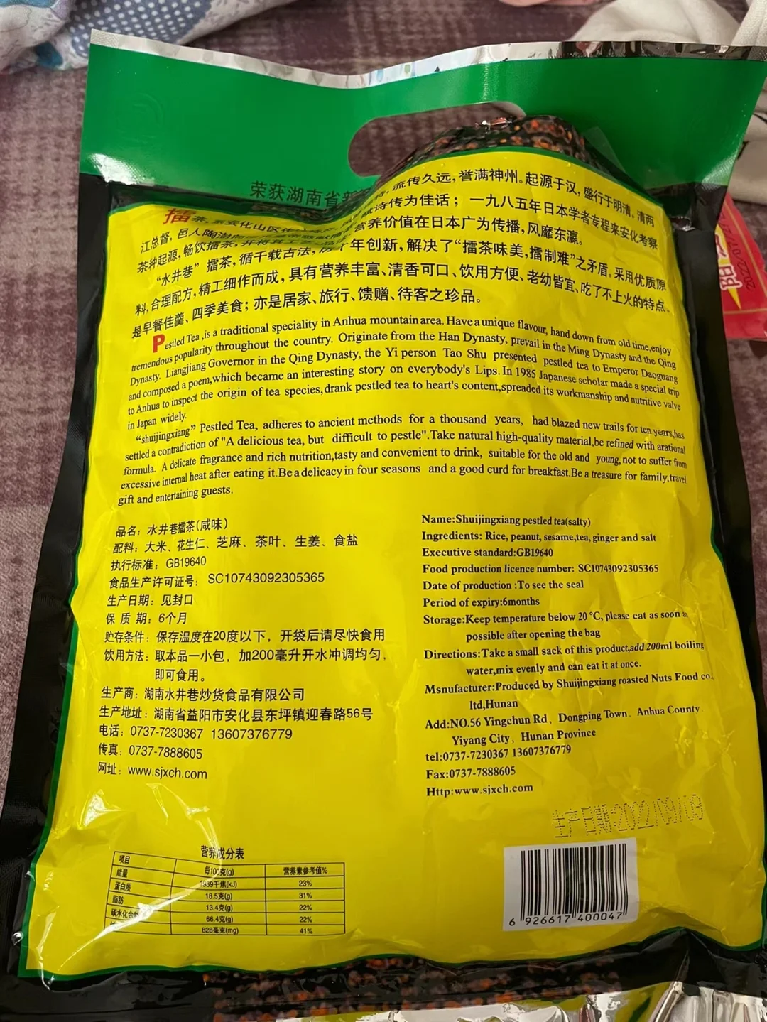 配料表有:大米、花生仁、芝麻、茶叶、生姜、食盐。配料表非常干净的,全是五谷杂粮磨制而成的,大米炒后加入到了里面,早上来上一碗非常养胃,减脂期可以适当吃一点,营养层次也很丰富,没有七七八八的添加,“咸口”脑袋必备!!!