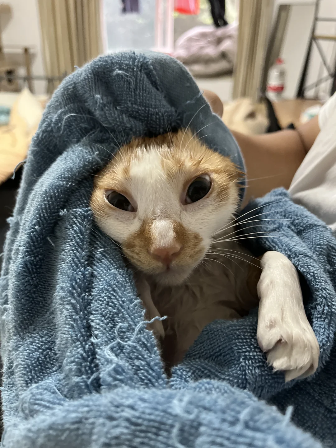 昨天晚上怀民在我床上拉了个粑粑。 为了不让他把我的床当成厕所, 今天奖励他洗个澡加深一下印象。 结果没想到小怀民洗澡只是骂骂咧咧,根本不挣扎。 洗完澡的怀民香喷喷的小小的一只,被浴巾裹着像个小婴儿。 吹毛发的时候也识相得一动不动,睁着大眼睛寻找逃跑路线。 床单被套已丢,新的猫砂盆和猫砂在快递来的路上。 谢谢各位姨姨提的意见,这几天会持续关注怀民软便的问题。 怀民作为互联网小猫,没有姨姨们的关心不知道要遭多少罪[哭惹R][哭惹R][哭惹R] 再次感谢姨姨们的热心提醒!