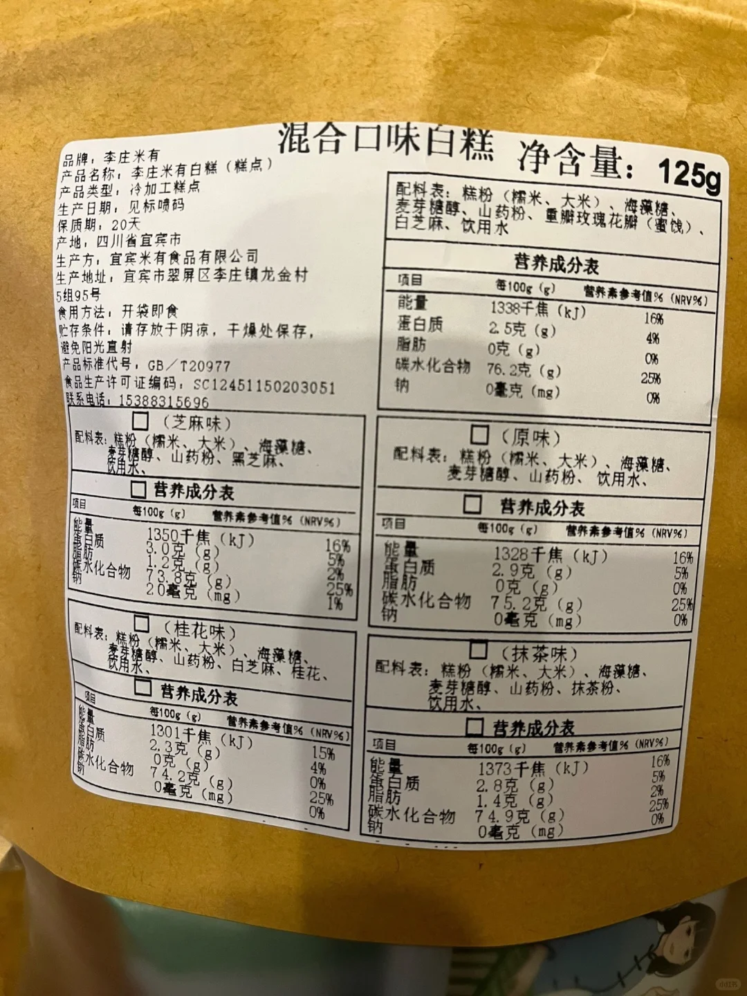 一打开就是那种很香的米糕的味道,而且是比较实的那种口感,料表干净,也不是特别甜,微微的甜度刚刚好,感觉和我去宜宾旅游买的没太大差别,我一直在找一款糯叽叽梗揪又不甜腻的糕点,终于找着了,有被惊喜到,强推!!!