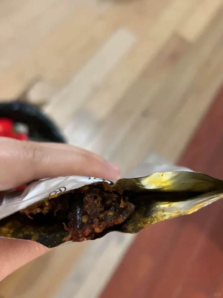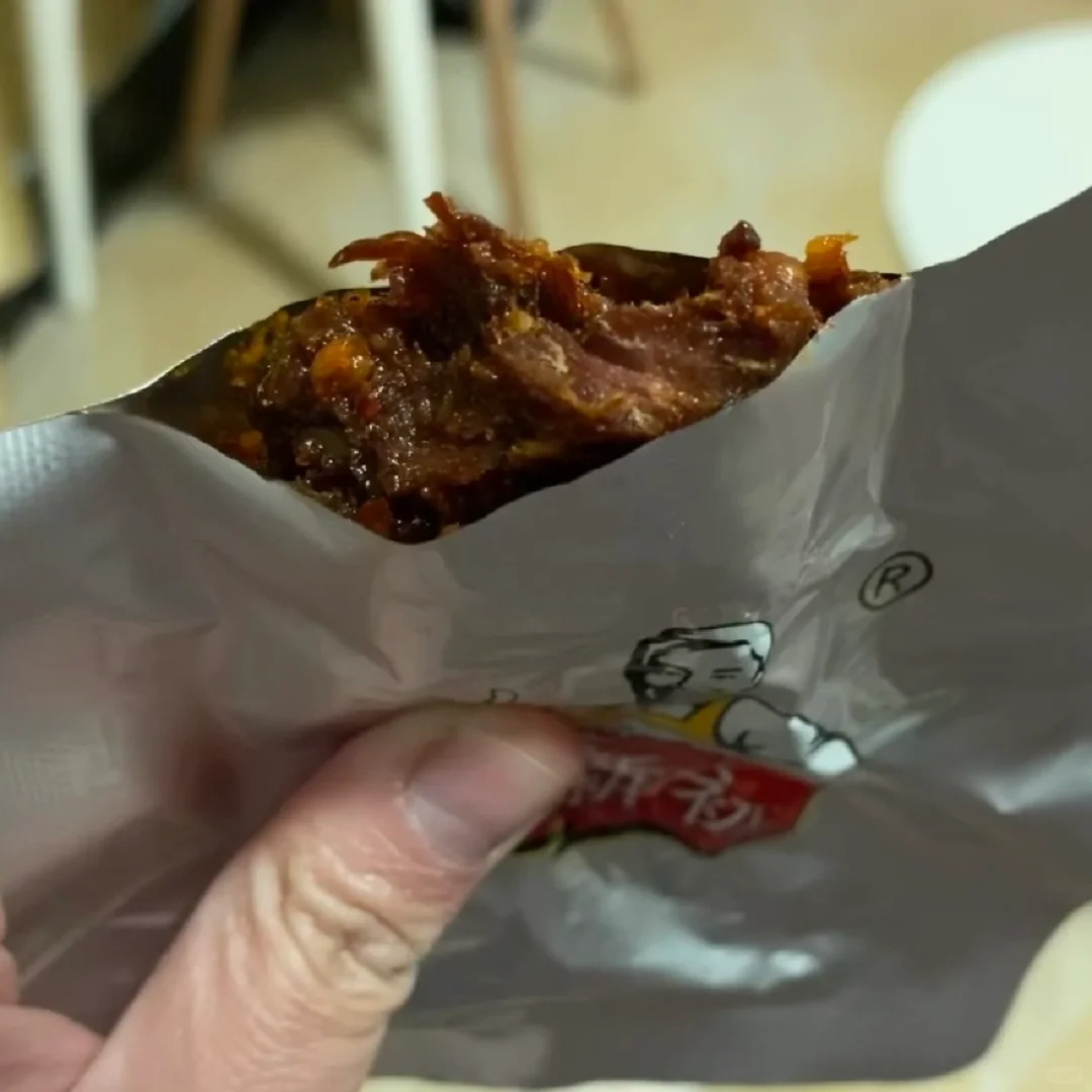 纯牛肉的,吃起来香辣,没有一点甜味,越吃越上头 可以配点小饮料一起,吃到后面辣味后劲挺足 喜欢吃辣的可以尝试一下(我喜甜辣口的 这个辣度对于我是有点辣了)。