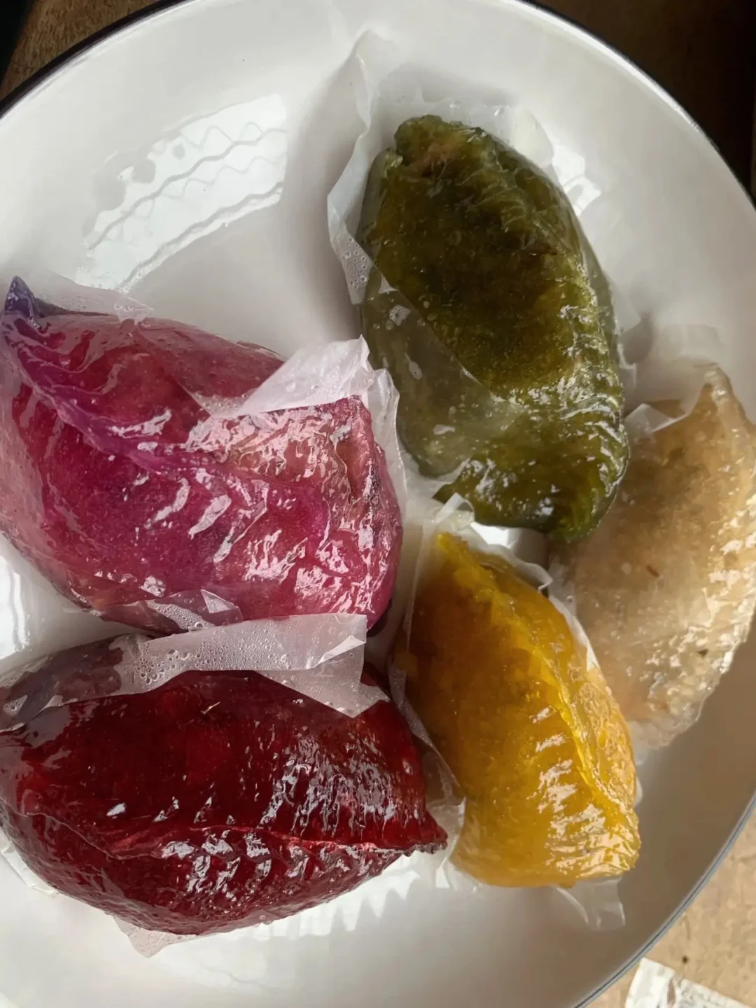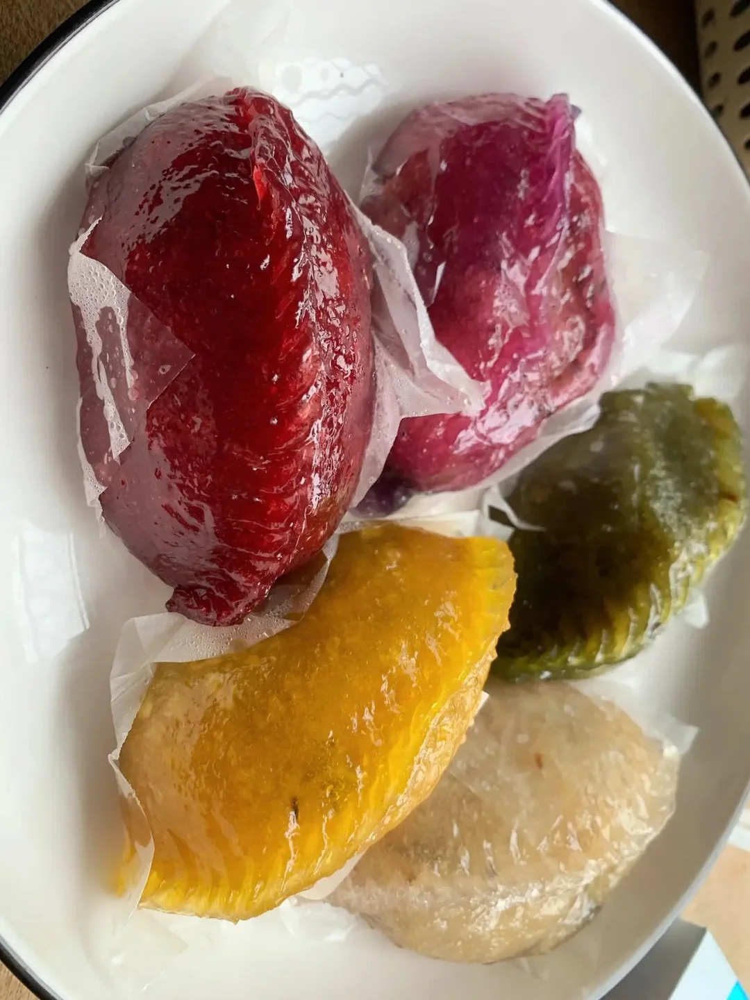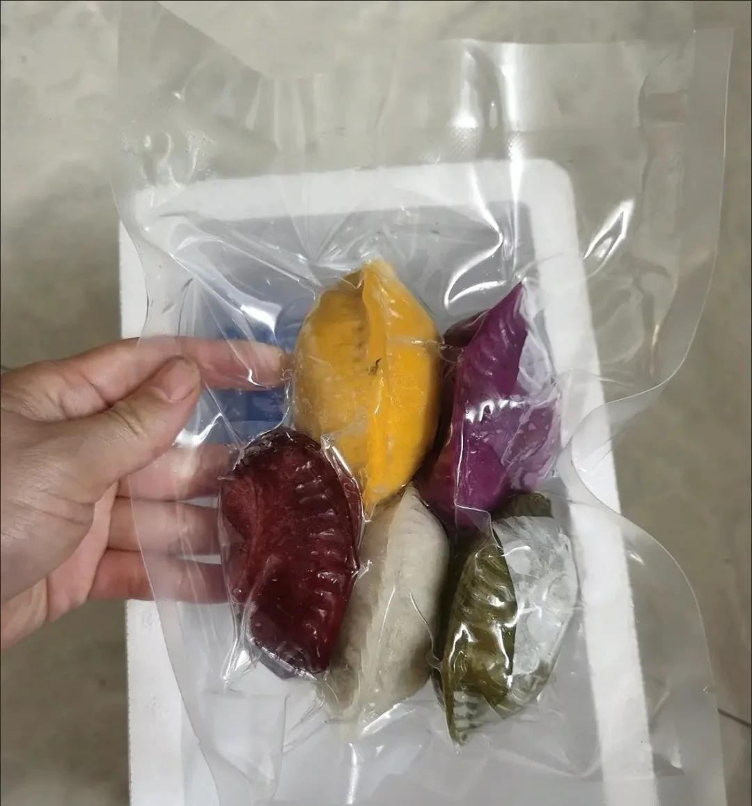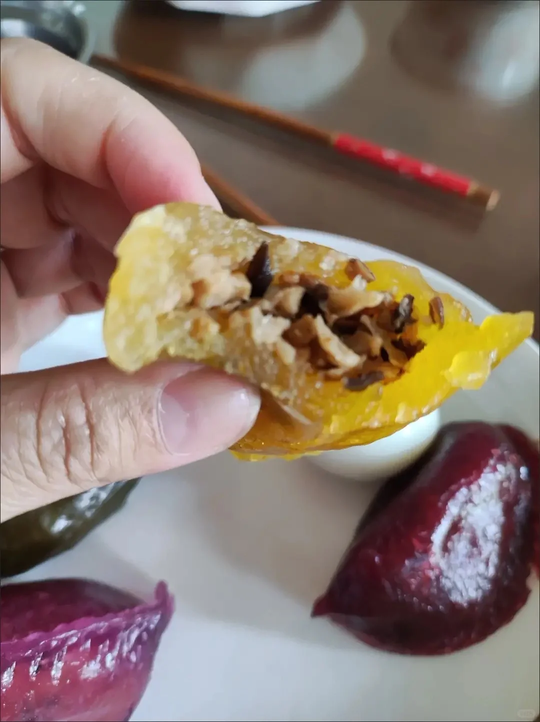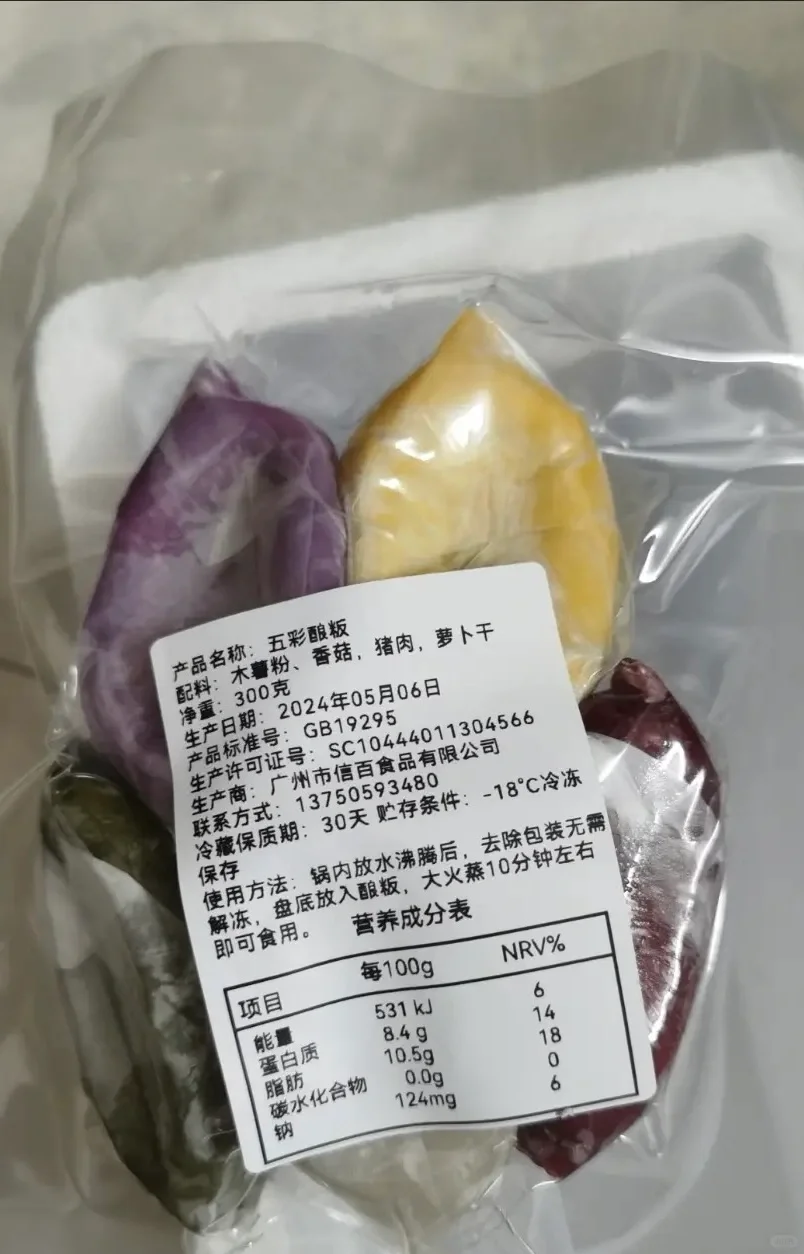 梅州五彩釀饭[黄金薯R],今天是一期广东梅州美食哦~ [种草R]健康指数:🌟🌟🌟🌟 配料表:木薯粉、香菇,猪肉,萝卜干,没有任何添加。 [种草R]性价比:🌟🌟🌟2袋/22.69r 性价比较高,有原味,紫薯,南瓜,菠菜,红曲五种口味,糯唧唧脑袋大满足[玫瑰] [种草R]口感:🌟🌟🌟🌟🌟 第一次买,没想到很赞,外皮弹弹的,有嚼劲,馅里萝卜干脆脆的,口感蛮好的[萌萌哒R]