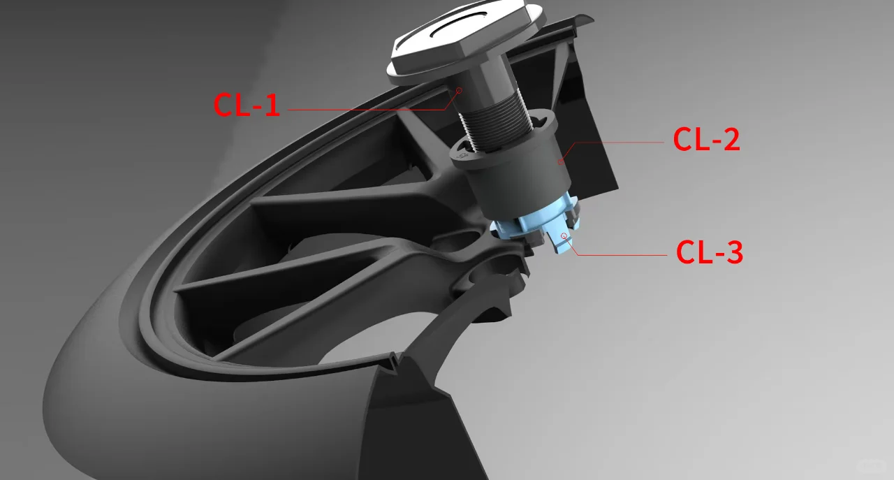 图2:中心锁(Center Lock)总成由 CL-1 :螺栓 CL-2:限位器 CL-3 :锁扣螺母 三部分组成