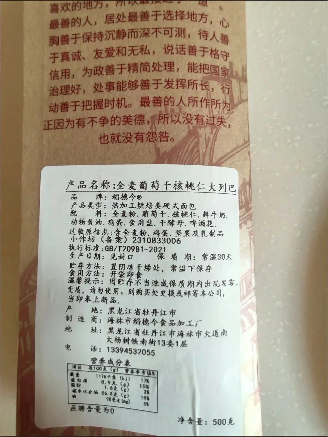 配料表有:全麦粉,葡萄干,核桃仁,鲜牛奶,鸡蛋,动物黄油,熟芝麻,食用盐,干酵母,啤酒花,配料表还是很干净的,感觉减脂期的姐妹可以用来冲,因为是全麦的,很有饱腹感,而且粗粮升糖指数比较低