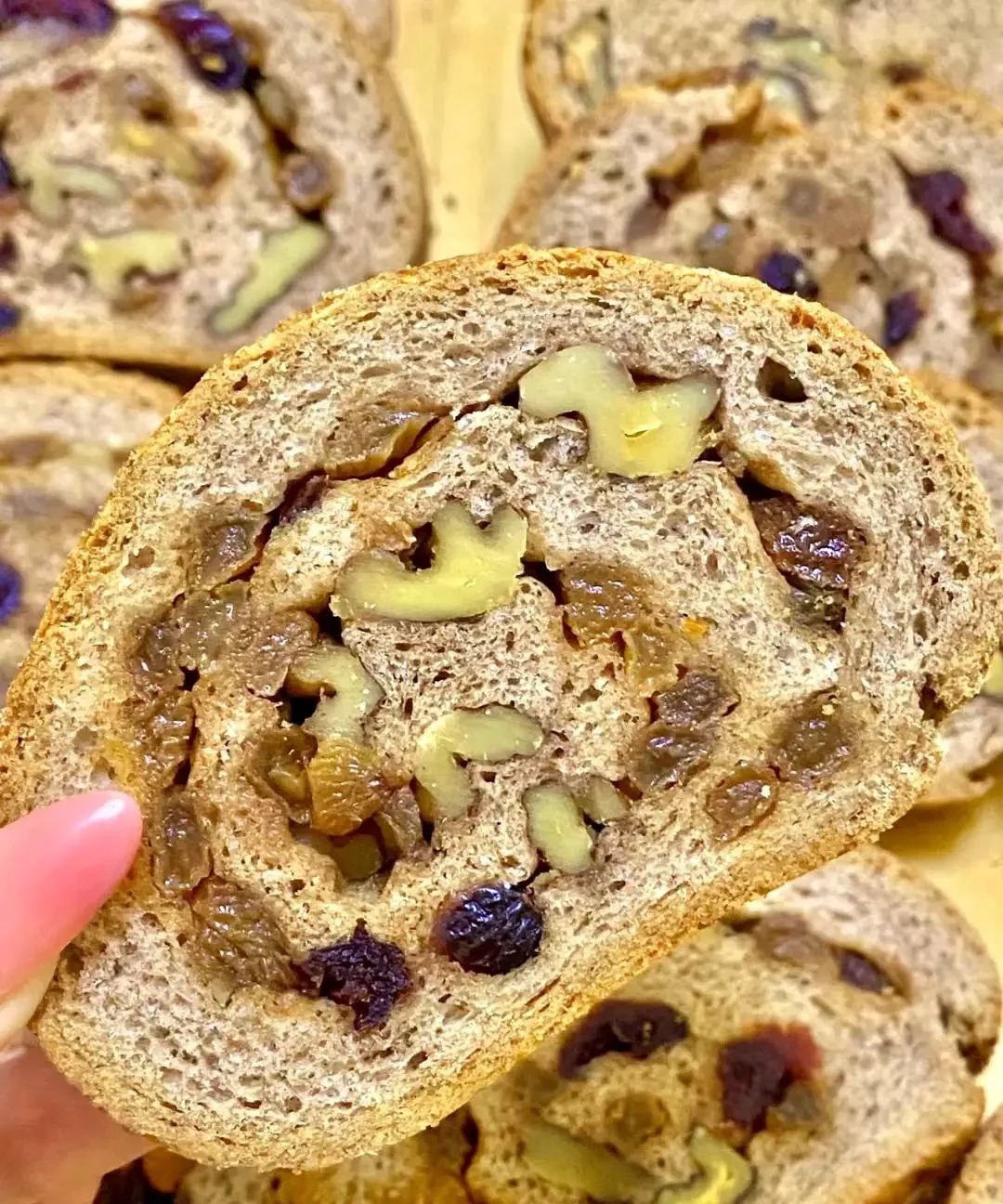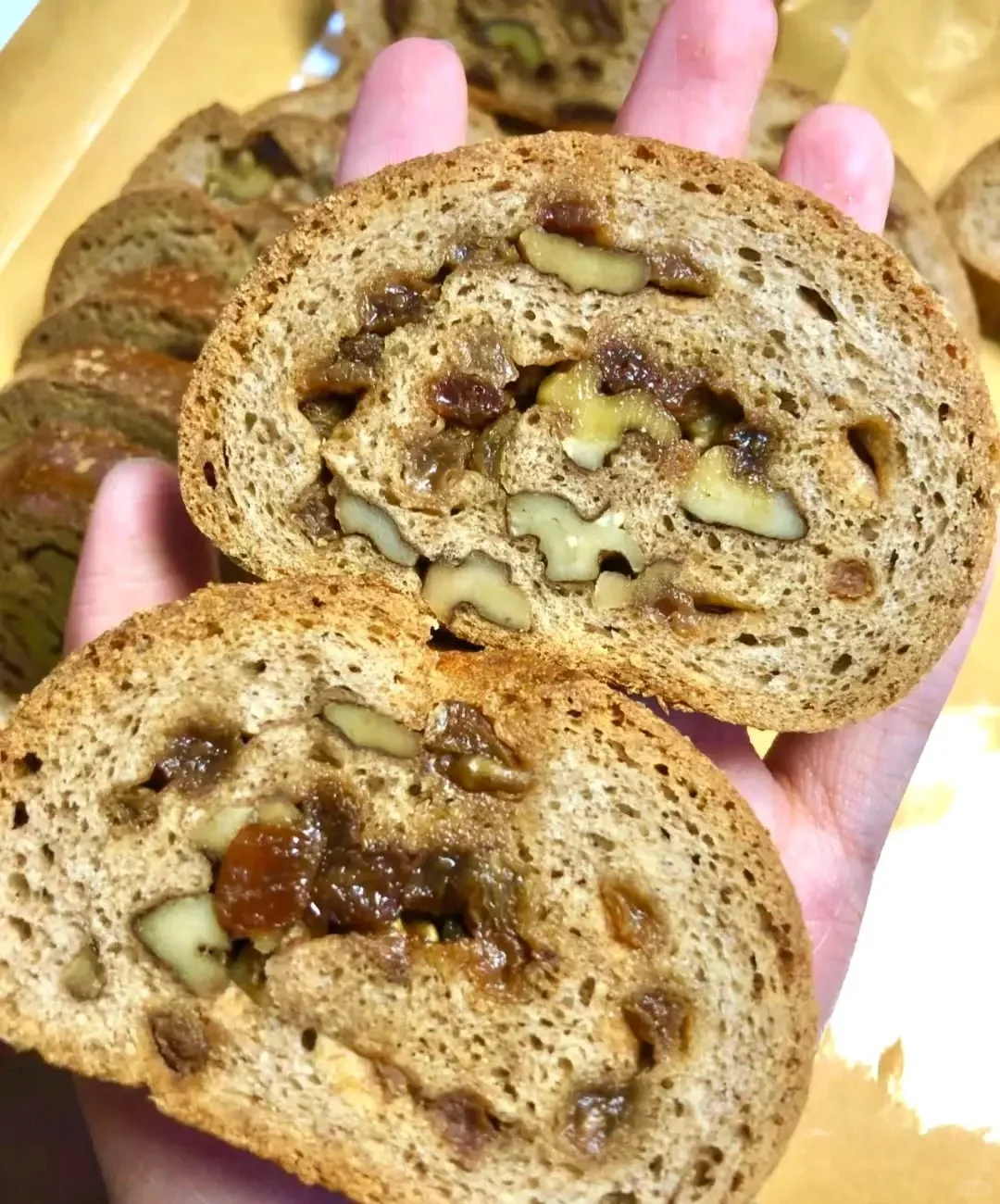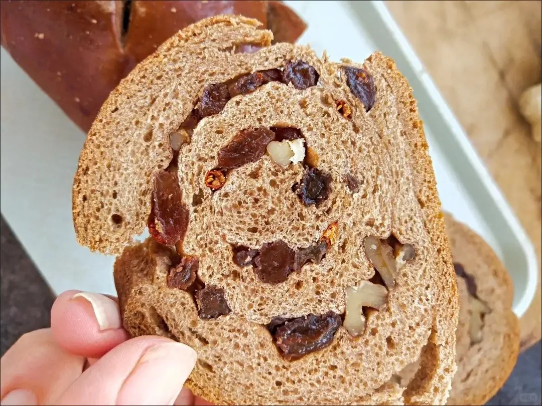 口味儿纯正,用料很实在,核桃新鲜,果粒很大,干果特别多,口感软糯香甜,馅料很丰富。我吹爆这款大列巴,碳水果仁脑袋狠狠满足了!!!巨多馅料,一打开就闻到浓烈香味,肉松几乎和面包体一样,好厚!!而且短保30天,肯定是没有科技与狠活的,配料表很干净!可冲,非常可冲!!