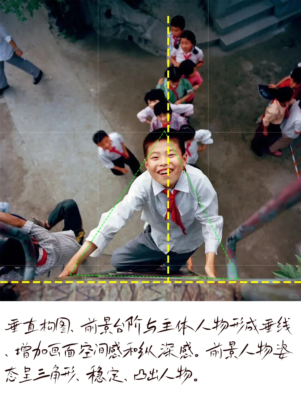 [一R]构图:垂直构图,前景台阶与主体人物形成垂线,增加画面空间感和纵深感。前景人物姿态呈三角形,稳定,凸出人物。