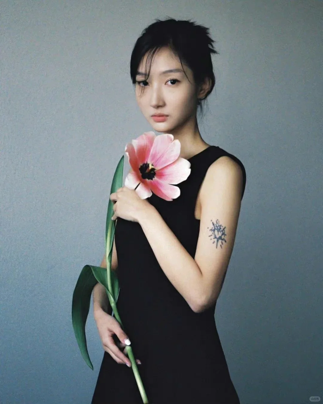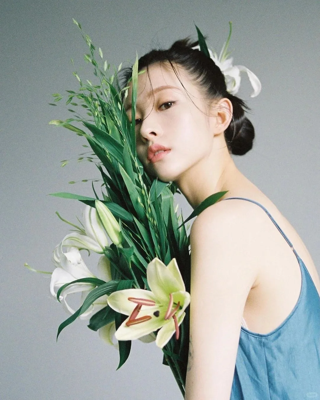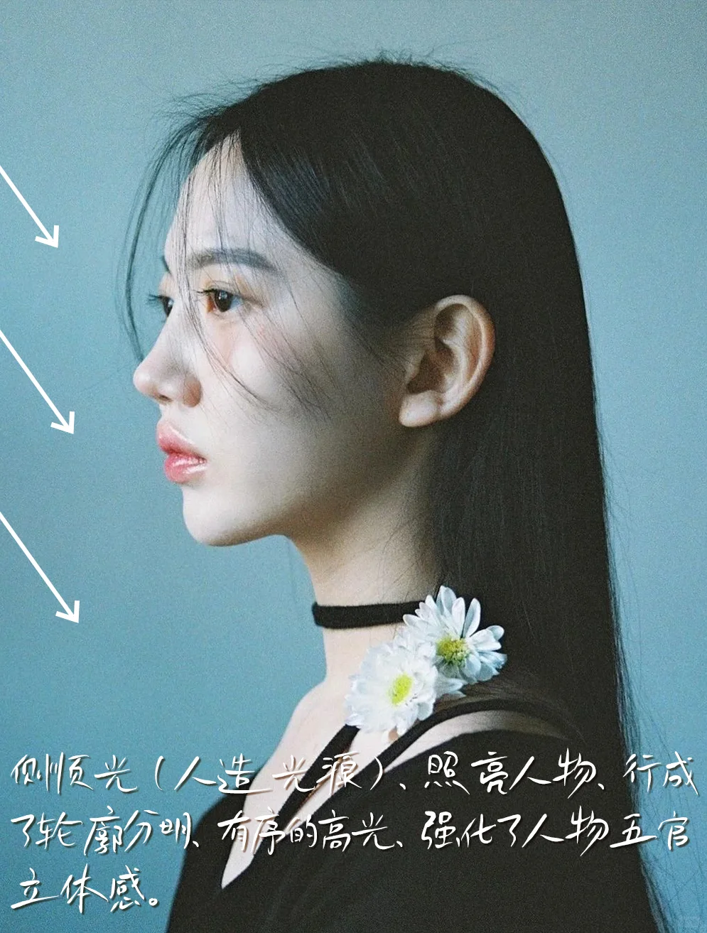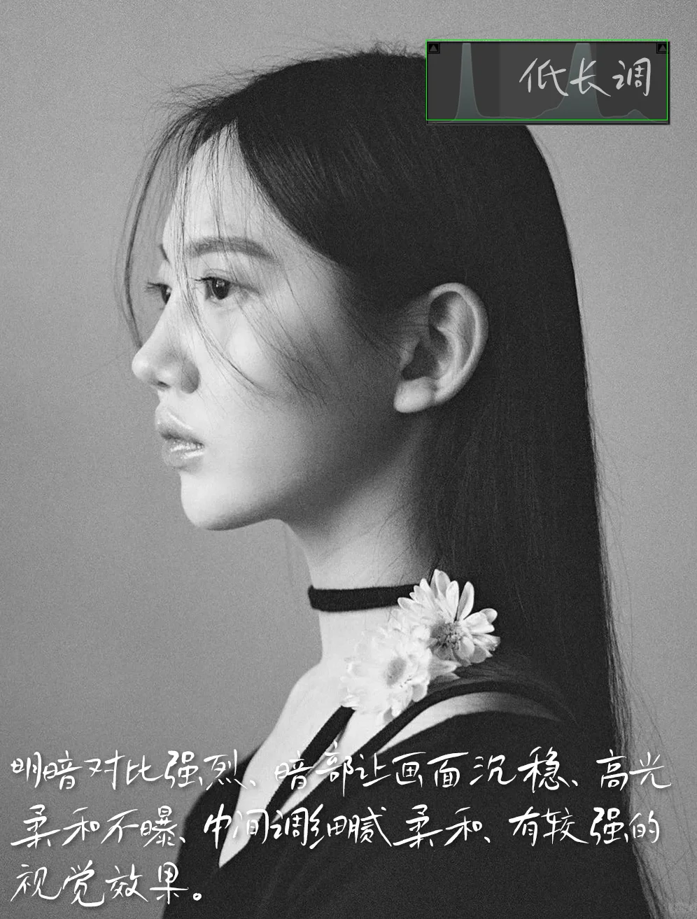 [六R]模特:模特微侧,面向光源,神情沉浸与画面整体风格契合。前期的的准备与构思很重要。发丝增加画面的虚实对比。增加女性的美感。小花点缀画面点题。