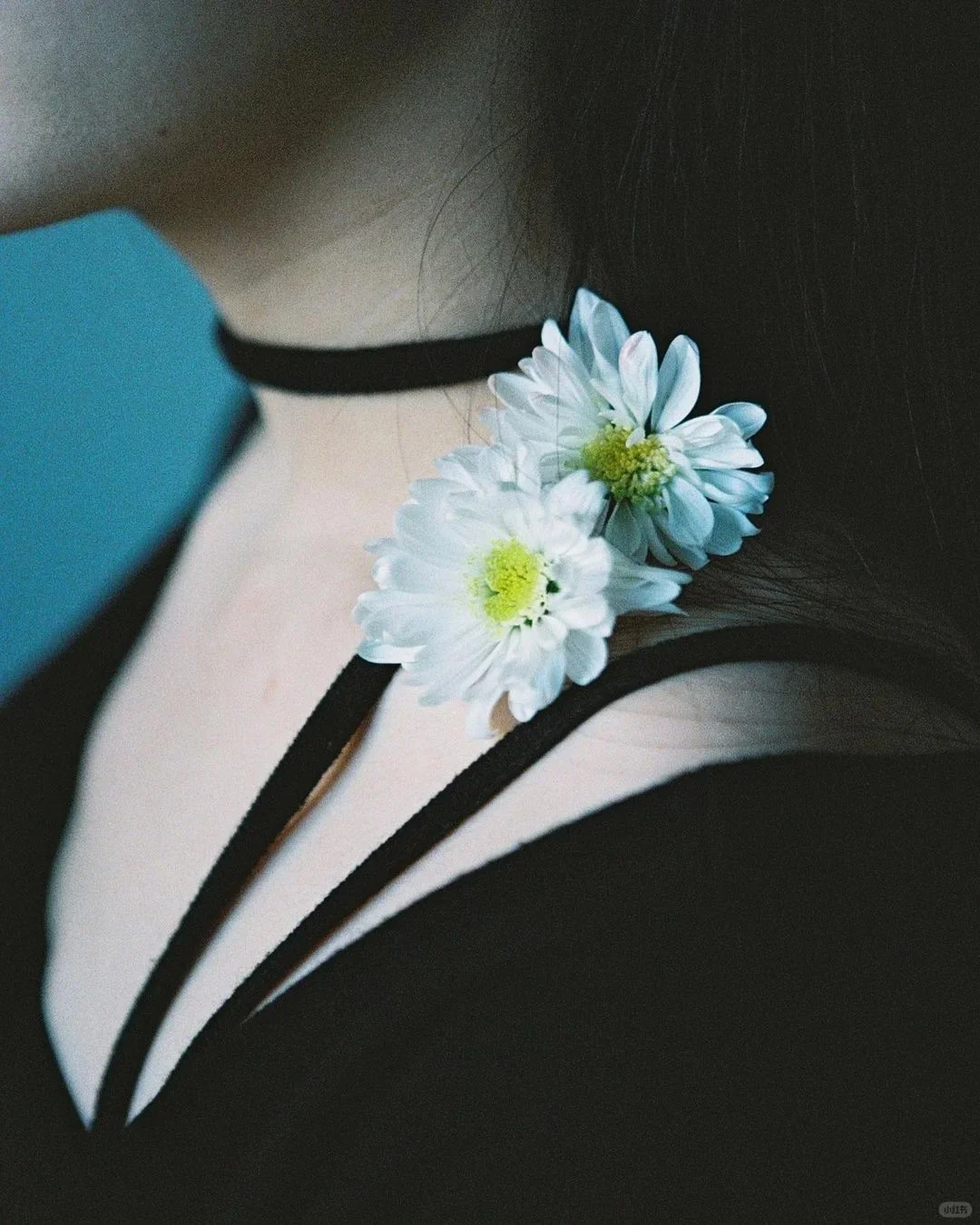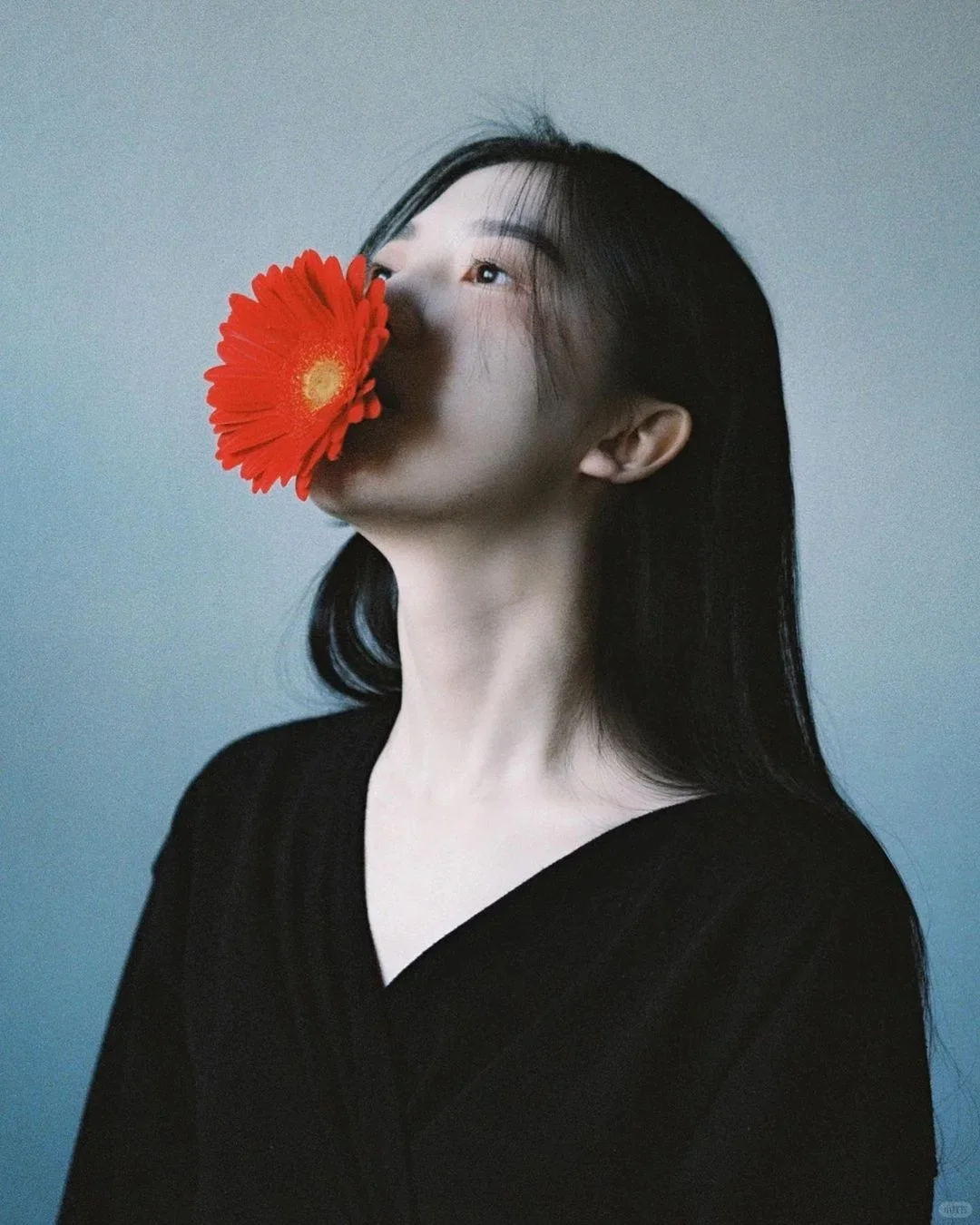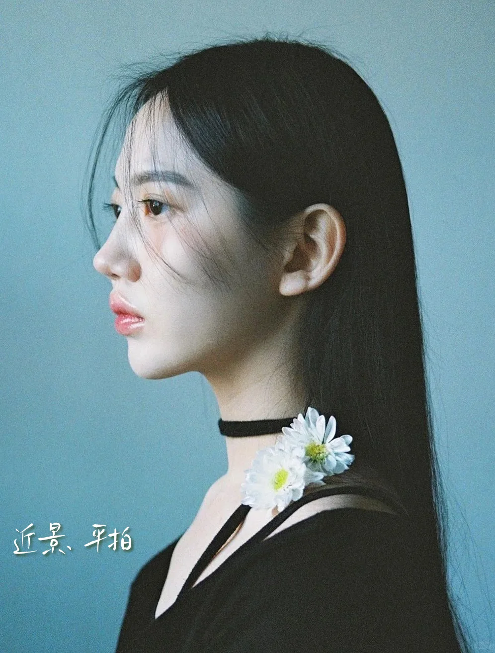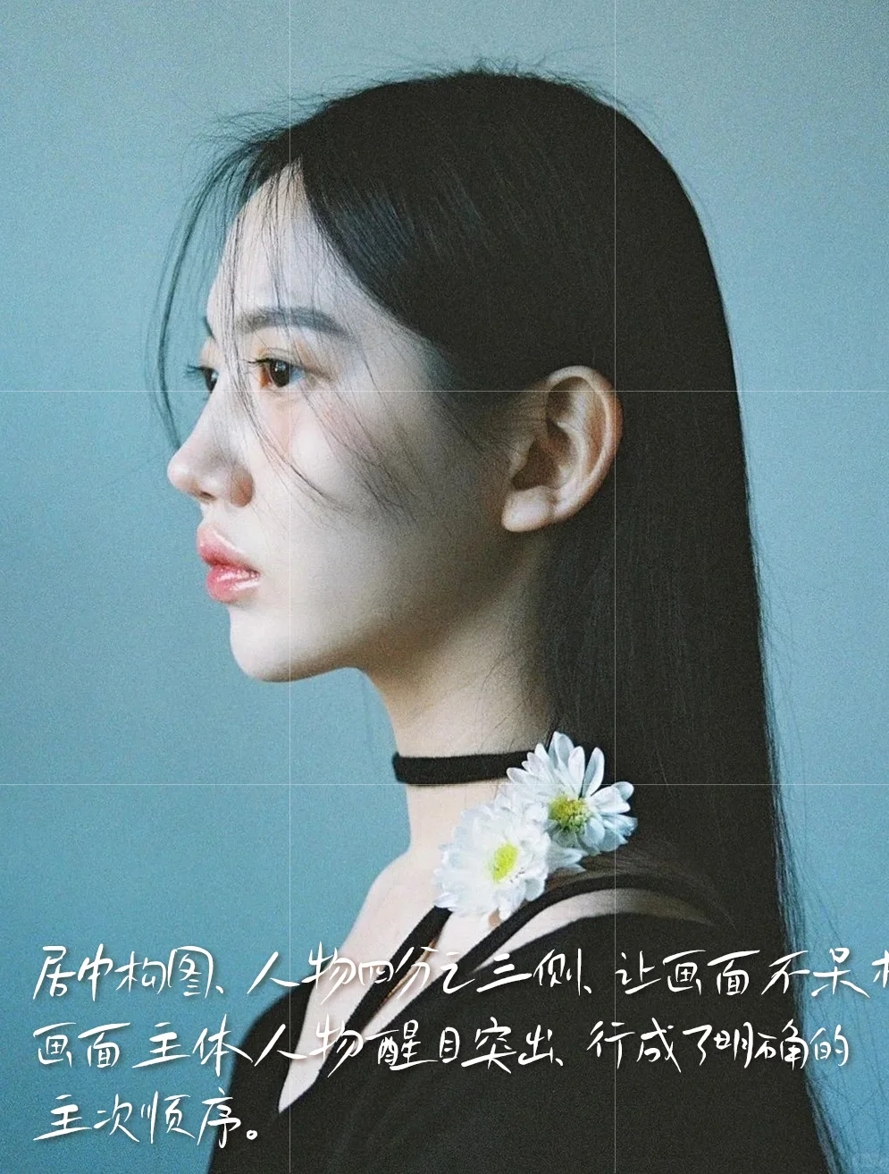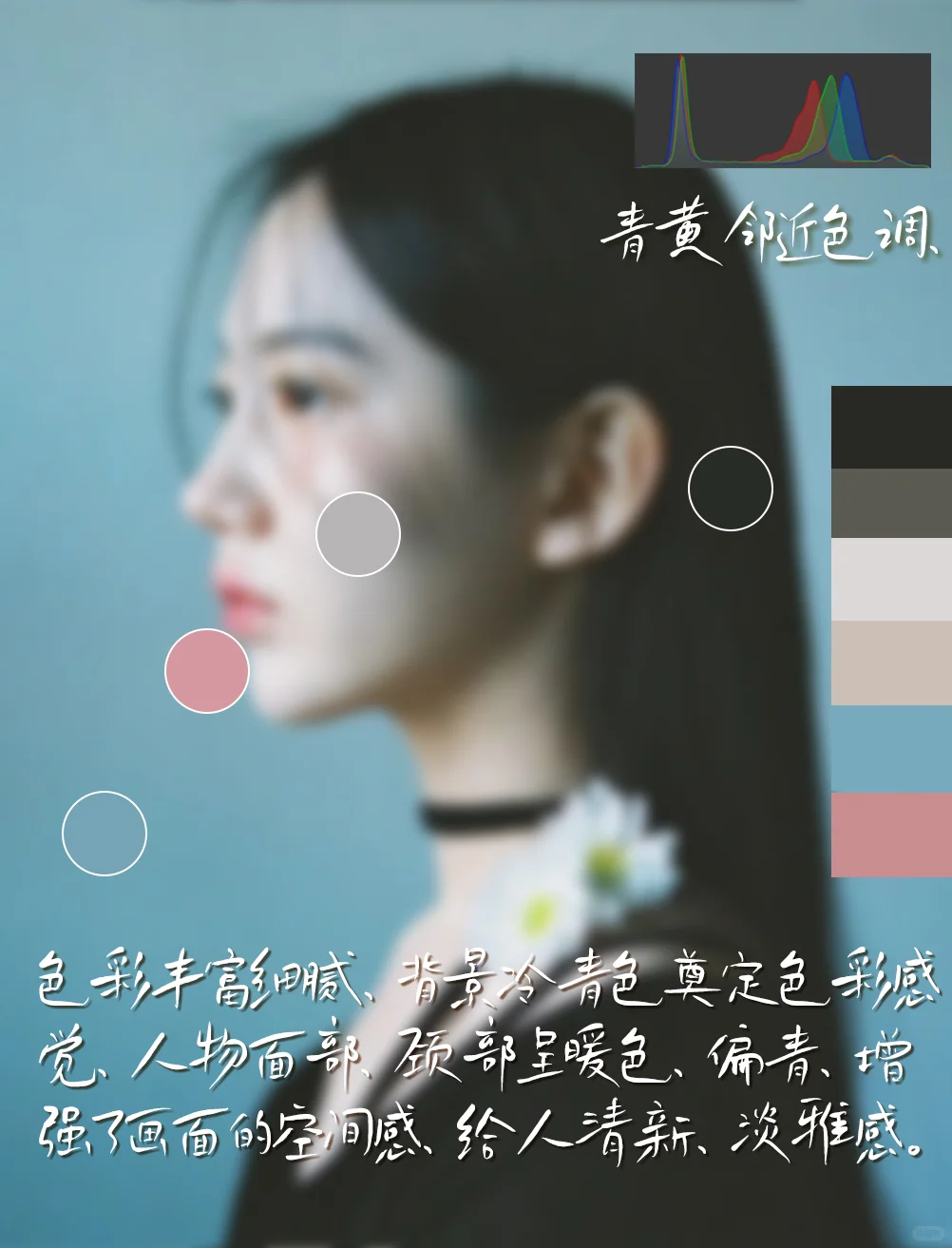 [四R]色彩:青黄邻近色调,色彩丰富细腻,背景冷青色奠定色彩感觉,人物面部,颈部呈暖色,偏青,增强了画面的空间感,给人清新,淡雅感。