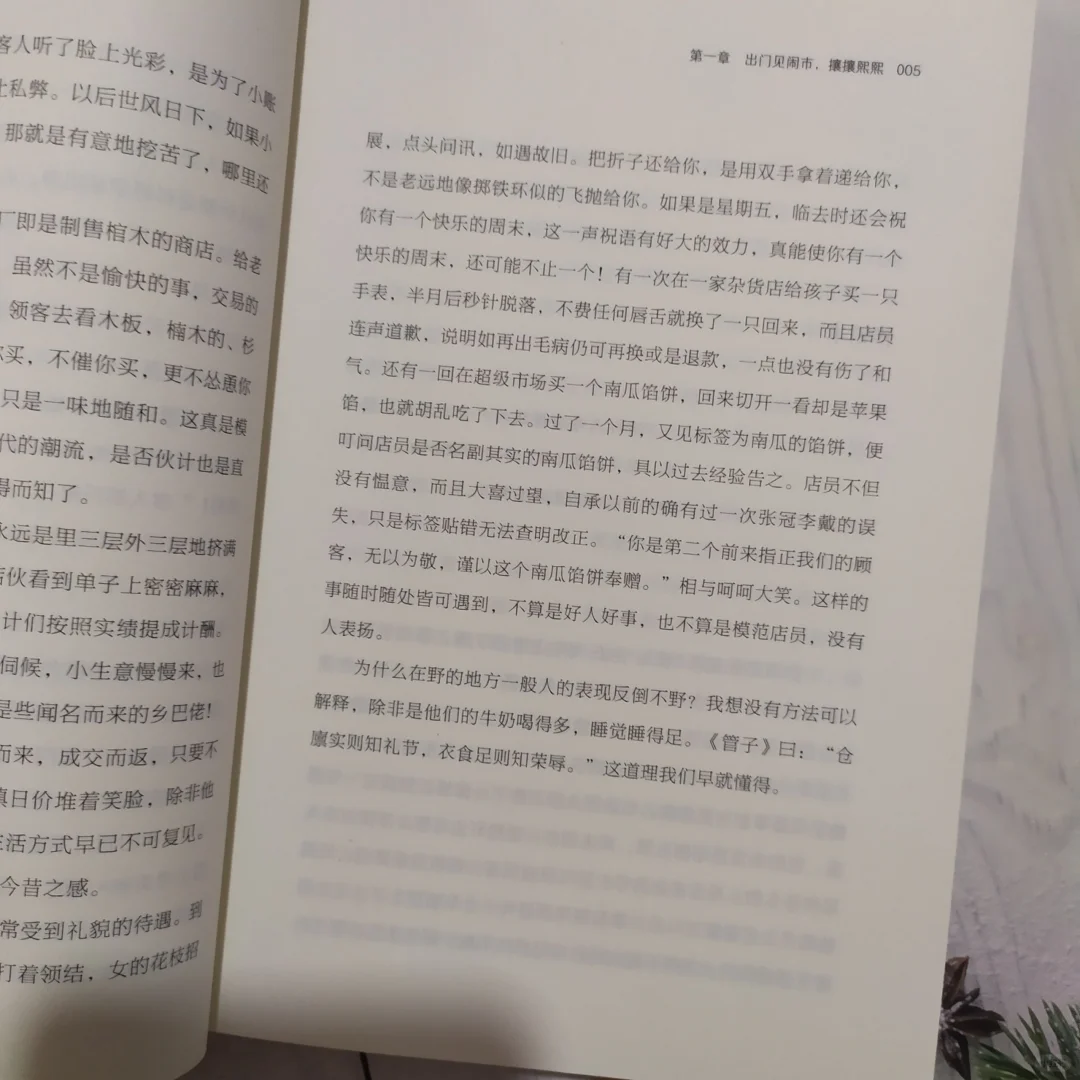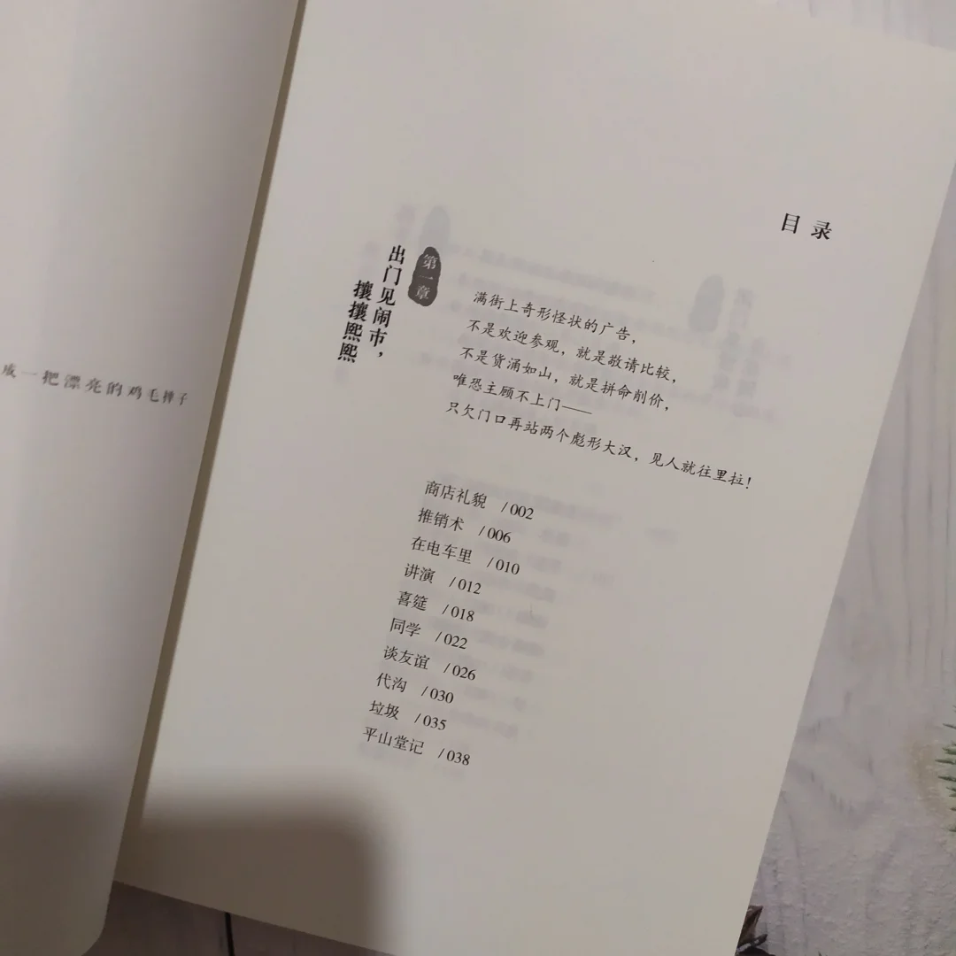 《商店礼貌》更是一篇充满日常气息的文章。他讲的就是当时北平的商店、饭店里的那些服务员的服务态度和精神面貌。他讲当时北平商店伙计们接待客人的彬彬有礼,一团和气,可真的比现在的超市中的服务员规格要高。他讲到去瑞蚨祥买绸缎,真的有一种宾至如归的感觉。饭店的那些伙计们更是有眼力价。去桅厂看棺木,掌柜的始终是一团和气,去同仁堂买药,去银行取钱的服务,去一个超级市场里边买南瓜馅饼的经历,可以看出商家们自觉地对服务的质量的要求都是很高的。