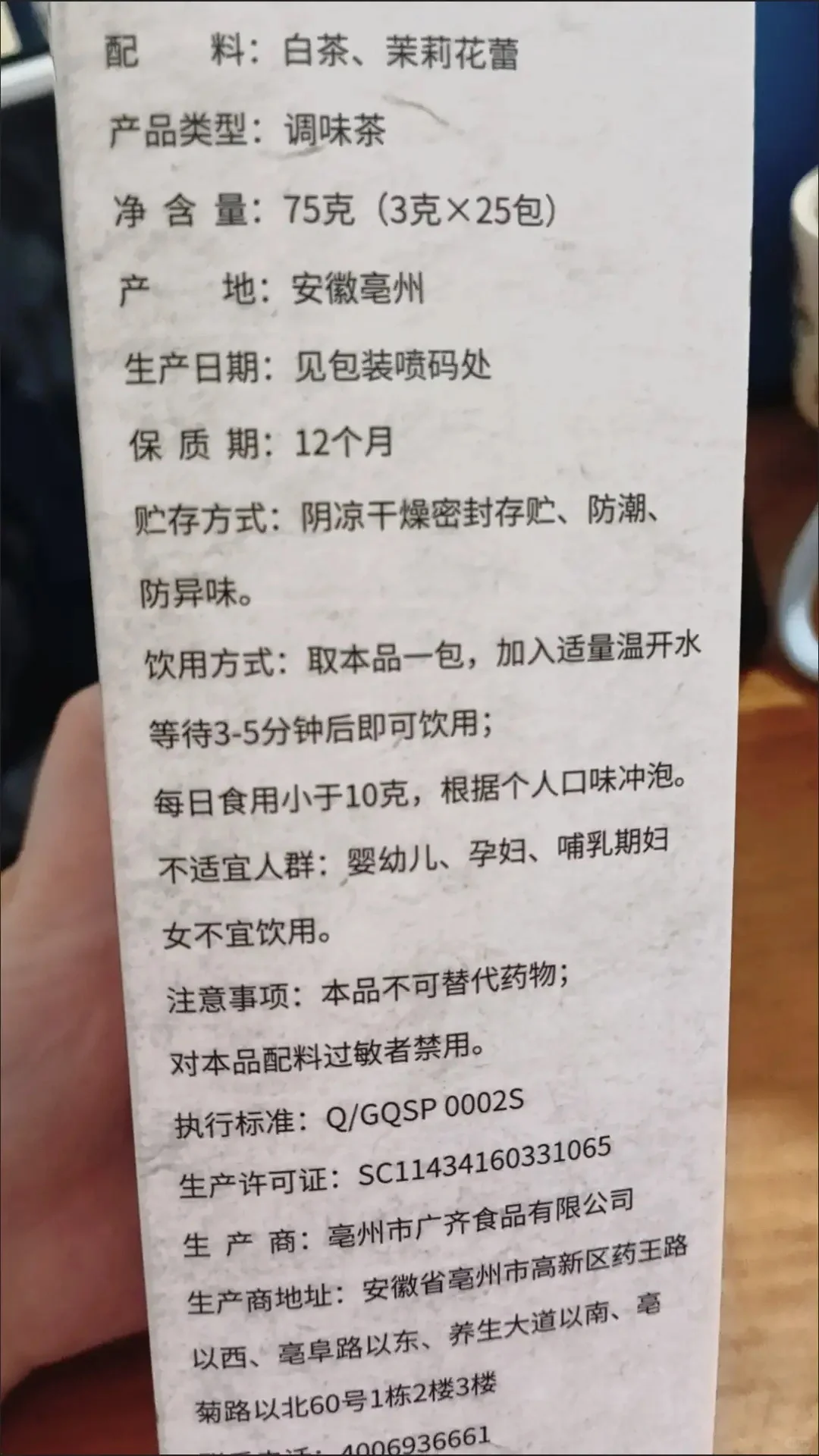 茉莉奶白[黄金薯R],今天是一期安徽省毫州特产哦 [种草R]健康指数:🌟🌟🌟🌟🌟 配料表:白茶,茉莉花蕾,没有任何添加,纯粹的茉莉花香还有茶味。 [种草R]性价比:🌟🌟🌟🌟🌟🌟4盒(100包)/29.8r 折合1包/0.29r,独立包装,携带方便,料很足,性价比很高 [种草R]口感:🌟🌟🌟🌟🌟 茶叶很香,小袋茶包方便泡茶,味道清香甘甜,泡出来茶汤清澈