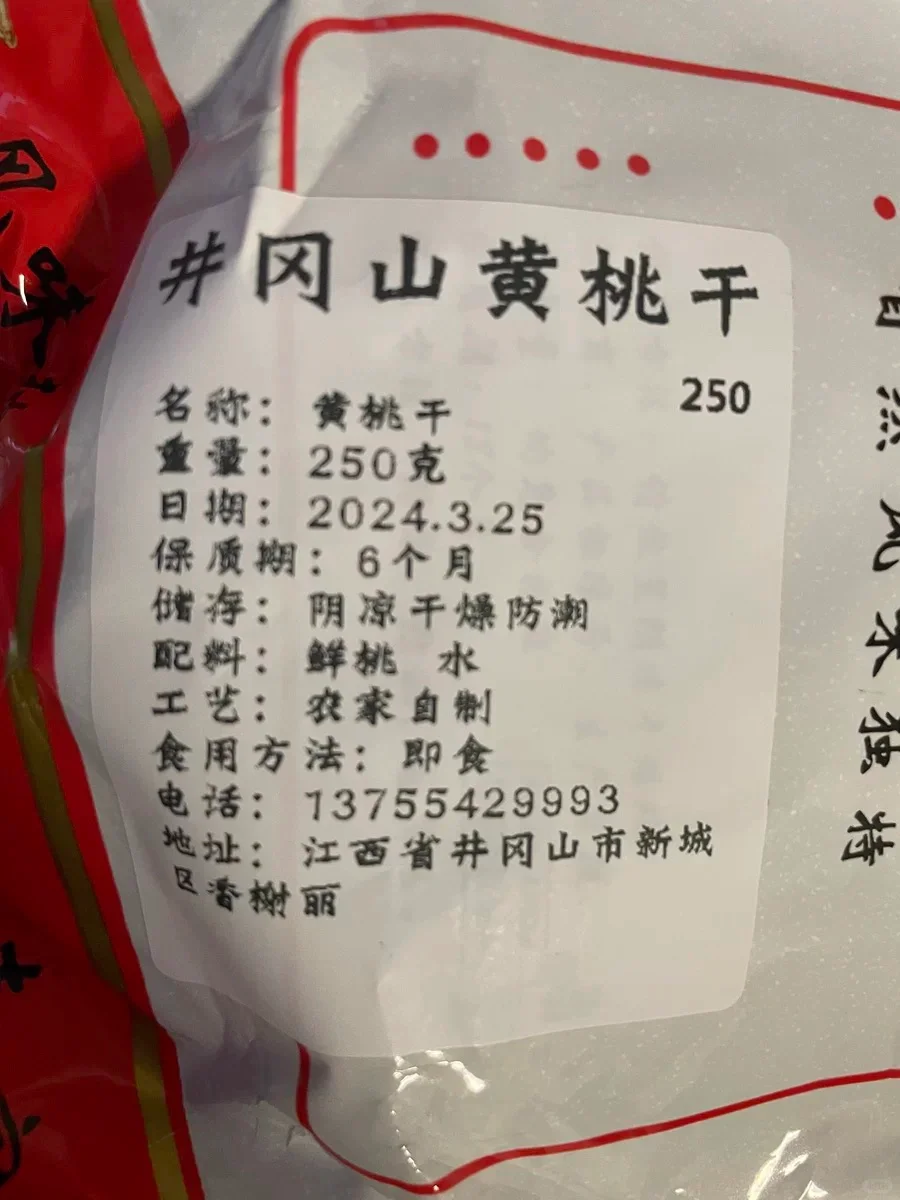 江西井冈山黄桃干[黄金薯R],今天是一期江西井冈山特产哦! [种草R]健康指数:🌟🌟🌟🌟🌟 配料表有:黄桃干,配料表非常干净的,纯黄桃晒制而成,老人小孩都可以食用。 [种草R]性价比:🌟🌟🌟🌟🌟1包(250g)/10.99r 折合10.99r一包,里面黄桃也比较多,感觉还是比较划算的,性价比高。 [种草R]口感:🌟🌟🌟🌟🌟 买了好多次的黄桃干,非常的好吃!软糯香甜,是果脯本身的甜酸味,没有添加其他的糖分,不会很甜,味道浓郁!超级好吃!