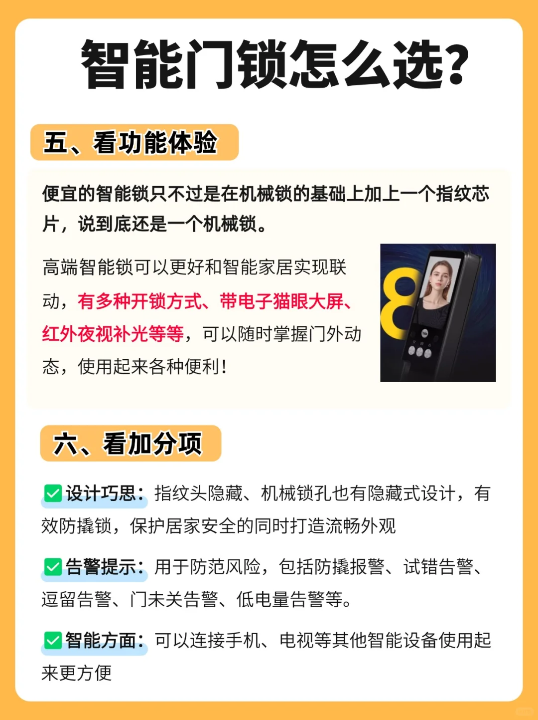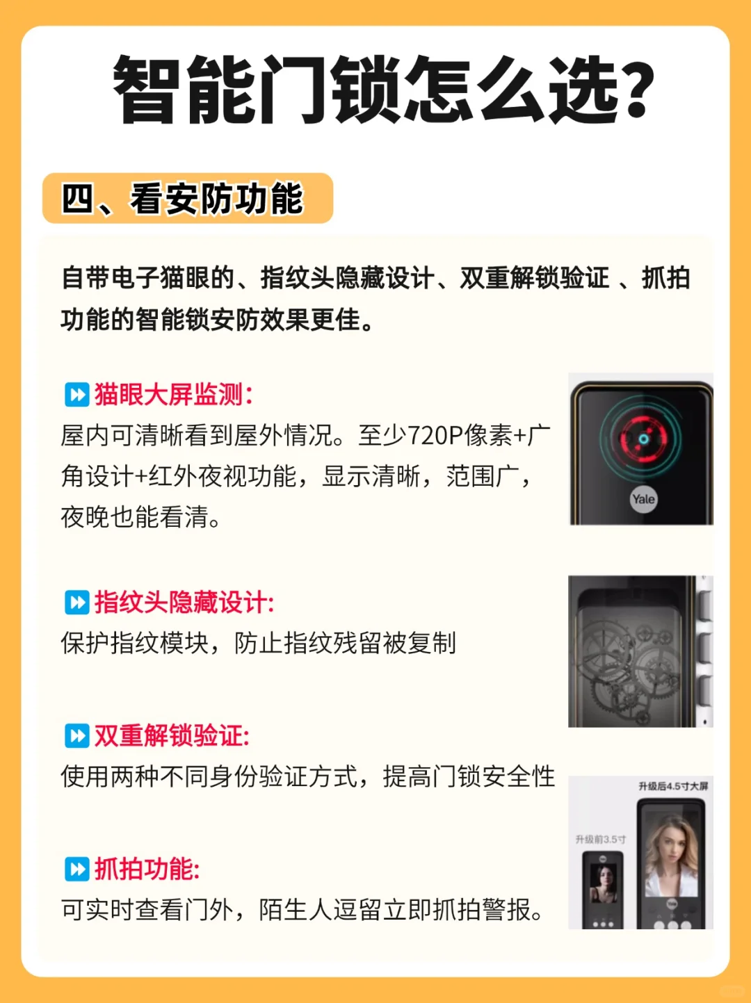 提供安全保障功能,例如防撬防破坏、内部强制锁定、虚位密码、猫眼功能等,以防止非法入侵。