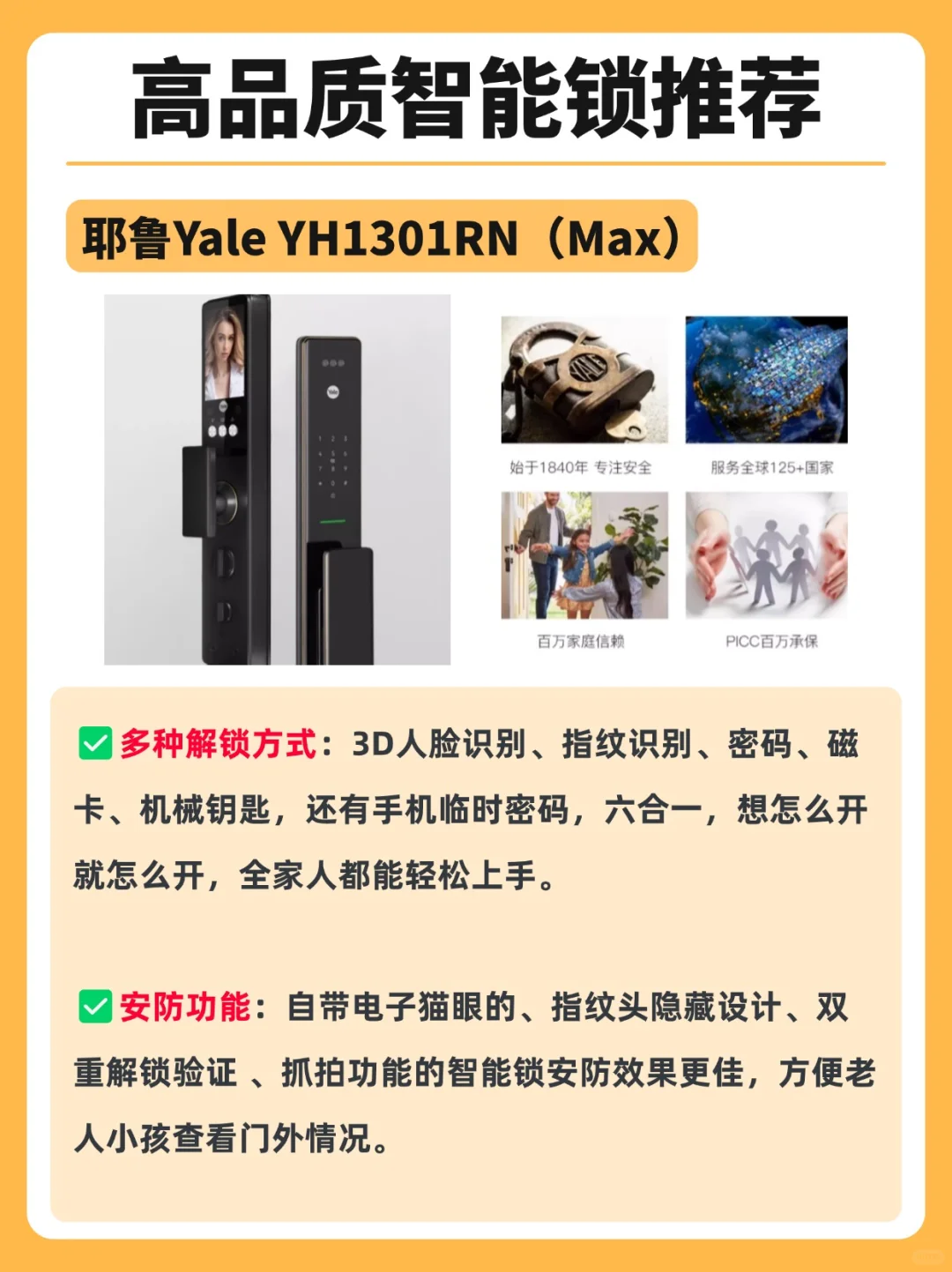 不过市面上智能锁功能配置各式各样!到底应该从哪些维度去挑选❓而且什么样的智能锁算是高品质呢❓我这里直接用耶鲁YH1301RNMax智能锁作为选购标准:
