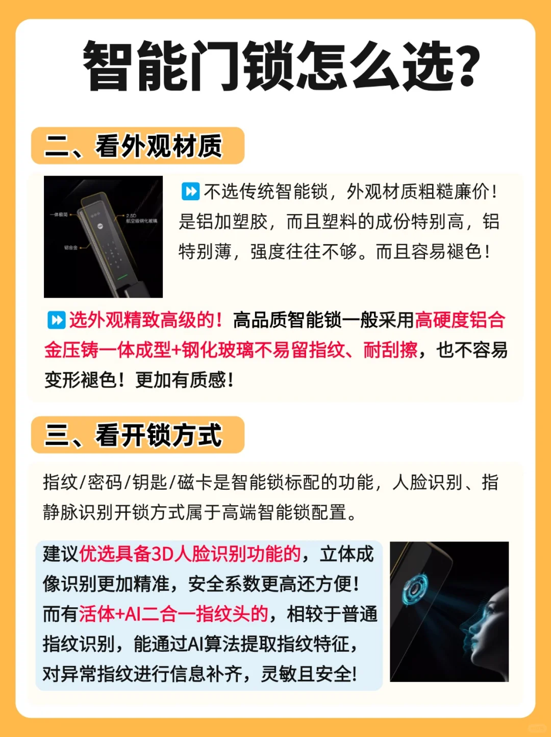 除了指纹解锁、3D人脸识别,还具备其他开锁方式,如密码、门卡卡、机械钥匙、手机临时密码等,以满足不同用户大多的需求。