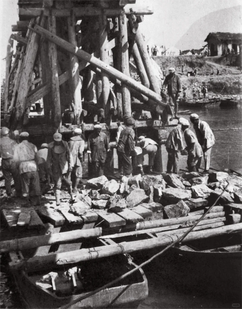 图2:1949年,抢修粤汉线铁路的解放军铁道兵团在新墙河大桥(岳阳境内)上作业