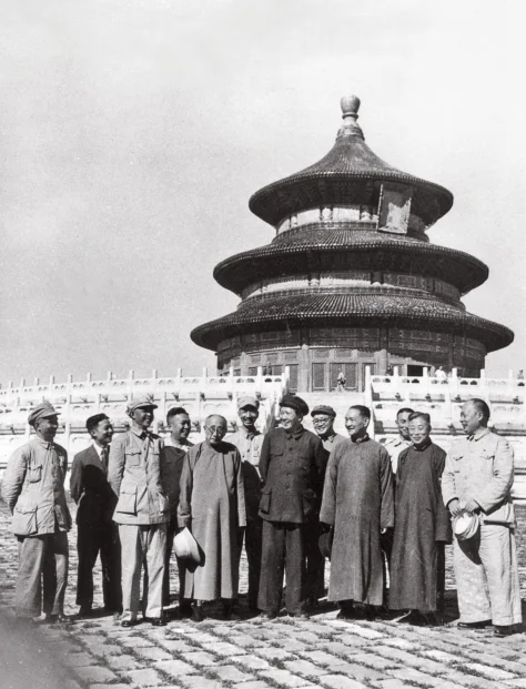 图6:1949年9月19日,主席(前排右四)邀请部分国民党起义将领和民主人士游览天坛。前排右二李明扬、右三程潜、右五张元济、右六陈明仁;后排右三李明灏、右四程星龄;陈毅(前排右一)、粟裕(前排左一)和刘伯承(后排右二)陪同前往