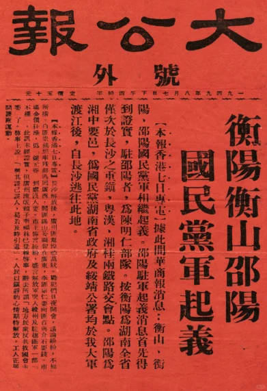 图3:1949年8月7日,《大公报》号外,湖南境内衡阳、衡山及邵阳的国民党部队起义的消息