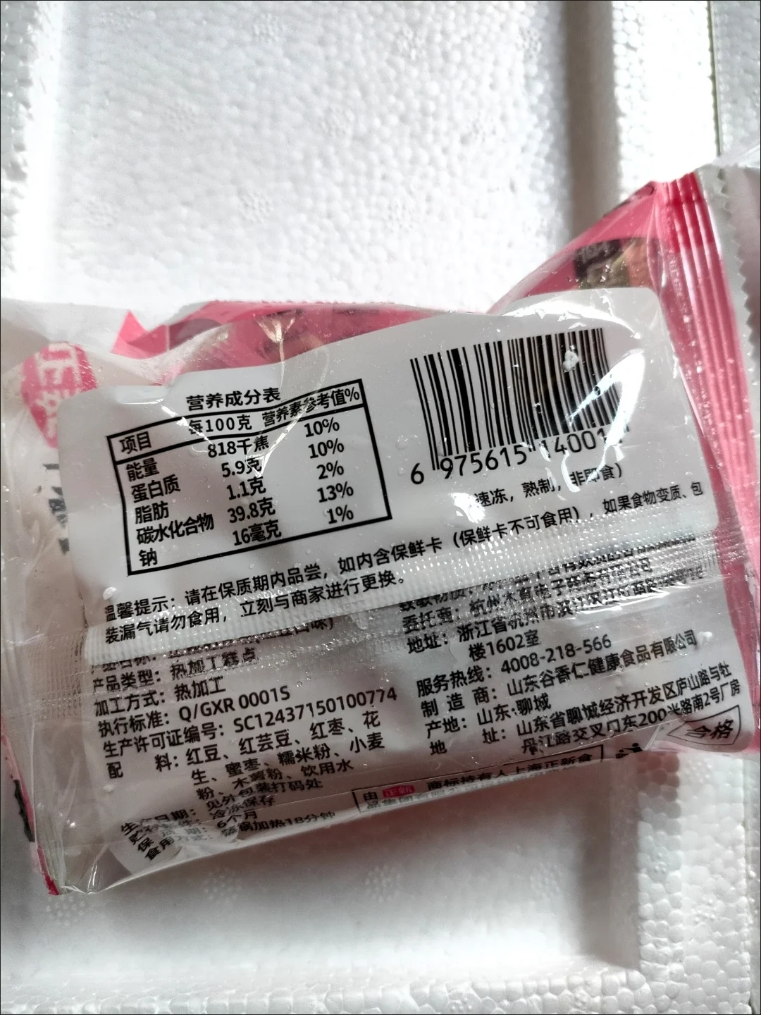 配料表有:红豆、红芸豆、红枣、花生、蜜枣、糯米粉、小麦粉、木薯粉、饮用水,配料表还是很干净的,全是五谷杂粮,粗粮升糖慢而且能促进肠胃蠕动。