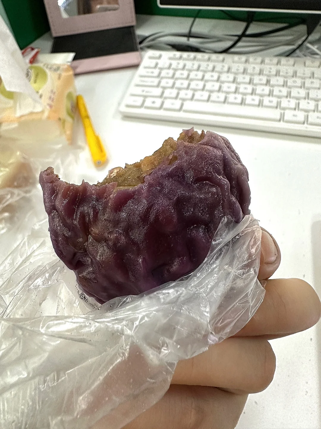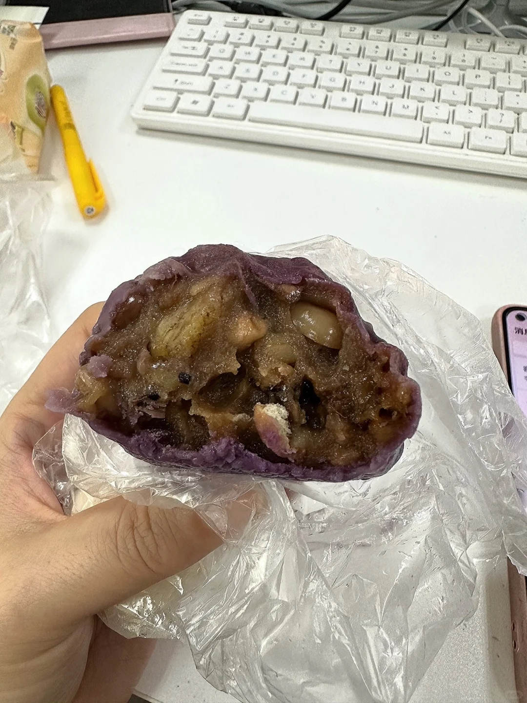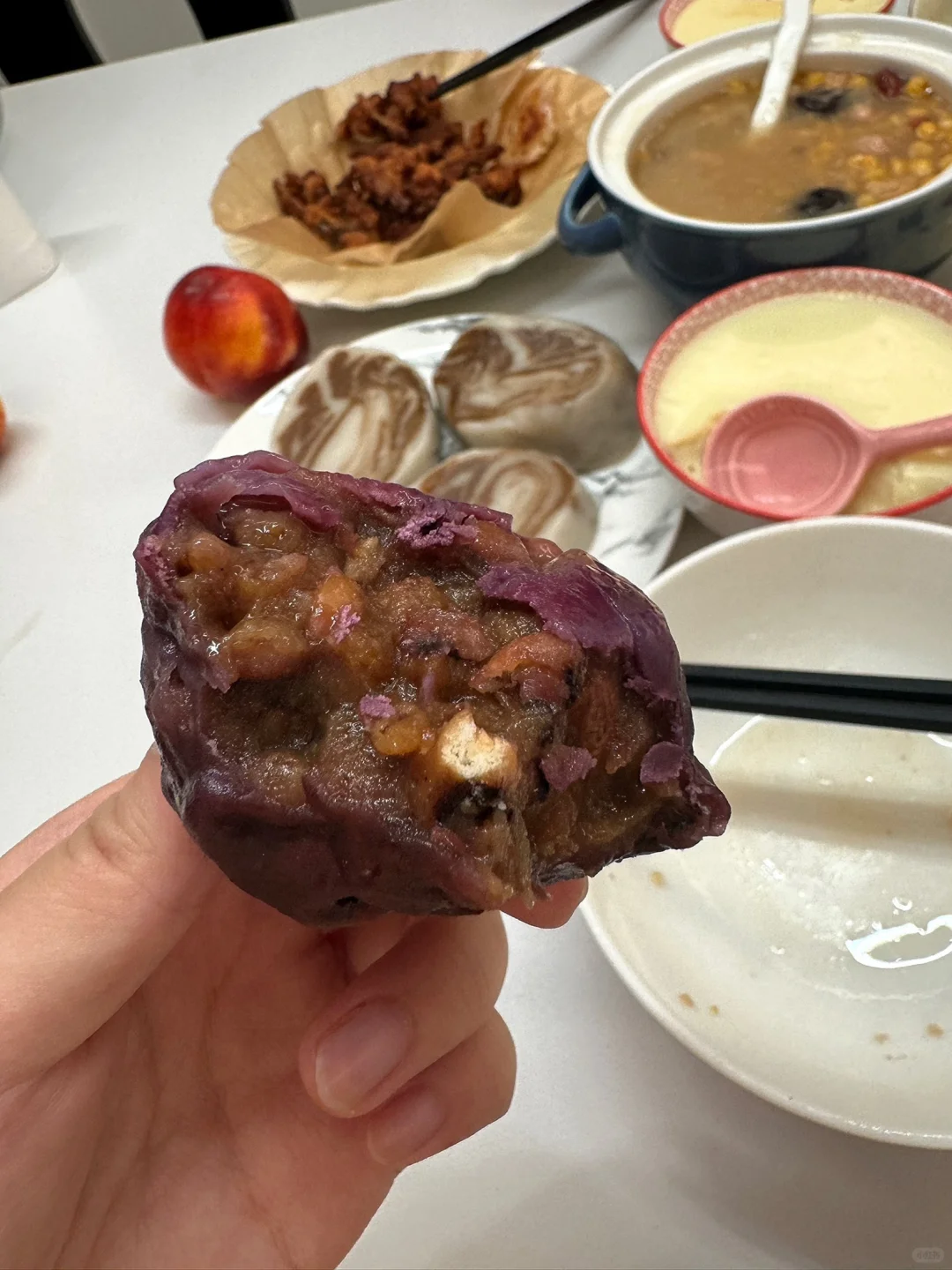 我买的是紫米的和红豆的两种口味,紫米的和红豆的都不是很甜,但是个人更爱红豆馅,是那种带着一丝丝甜味的!口感很好,喜欢吃甜甜口味的可以自己加糖!梗啾啾脑袋爱死啦!!!强推!!