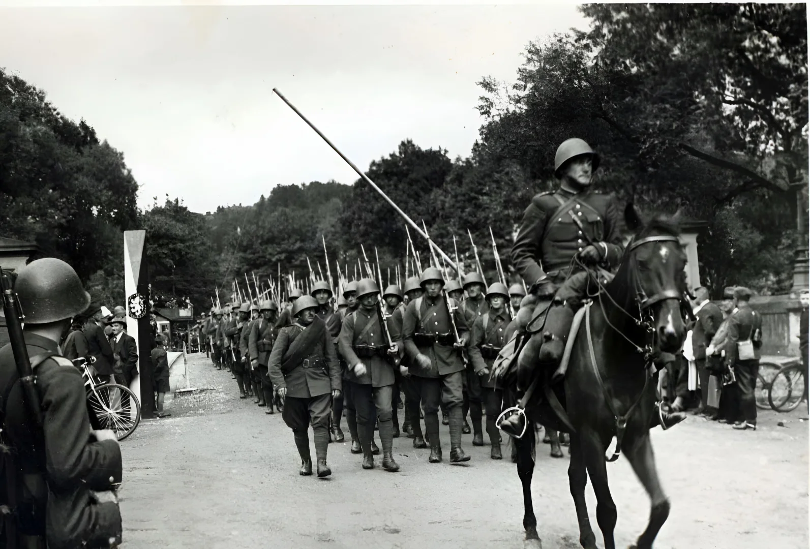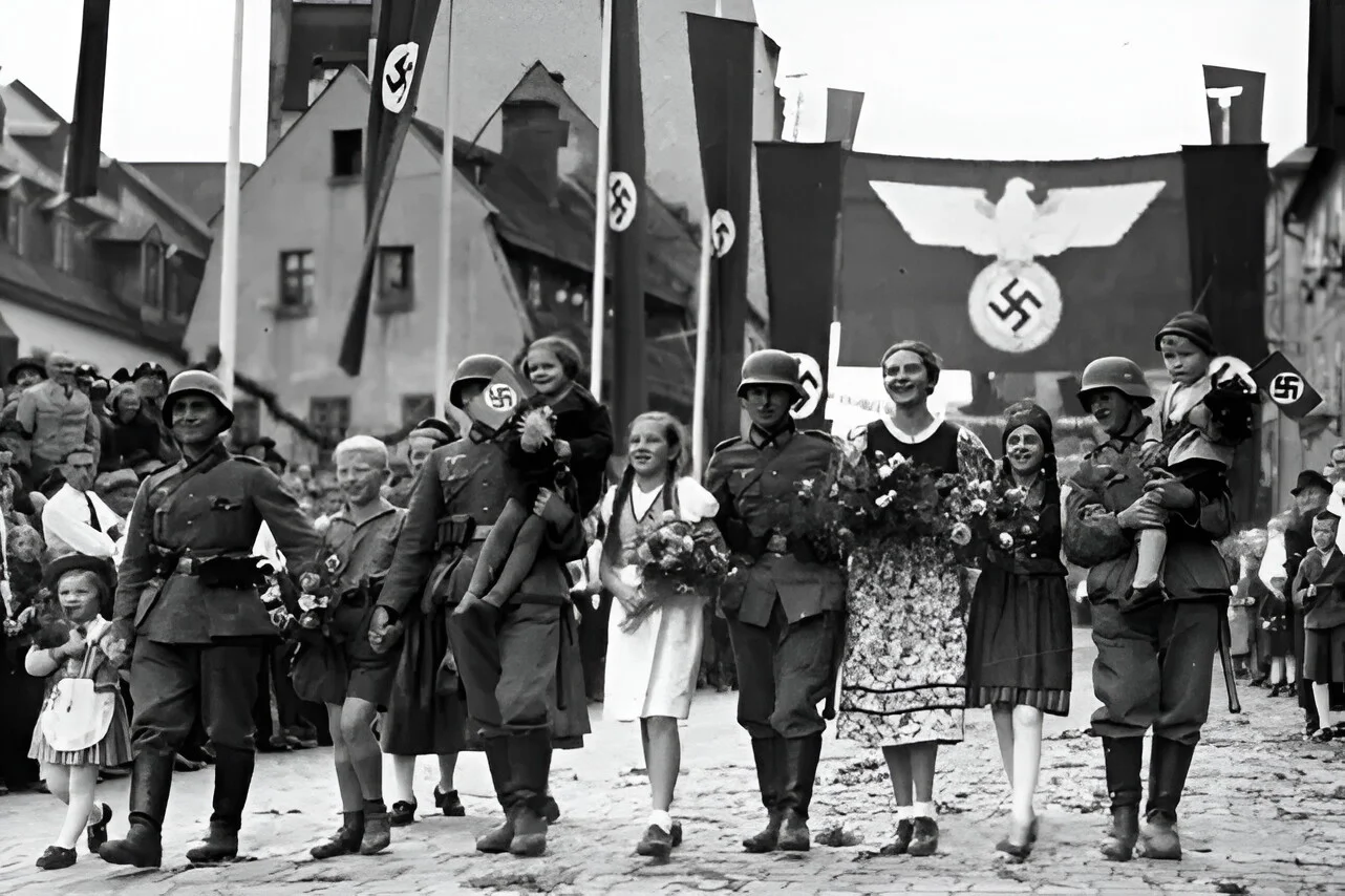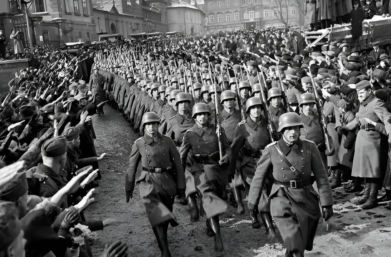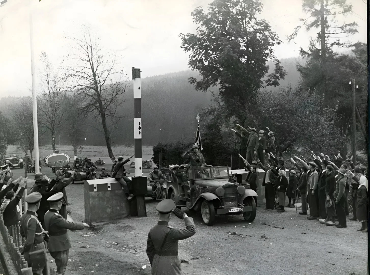 图7:捷克阿什镇的居民正在为德国军队举行欢迎会,这里的居民大多都属于德意志民族,从而对德军的来到感到非常喜悦,认为他们又重新回到了祖国的怀抱