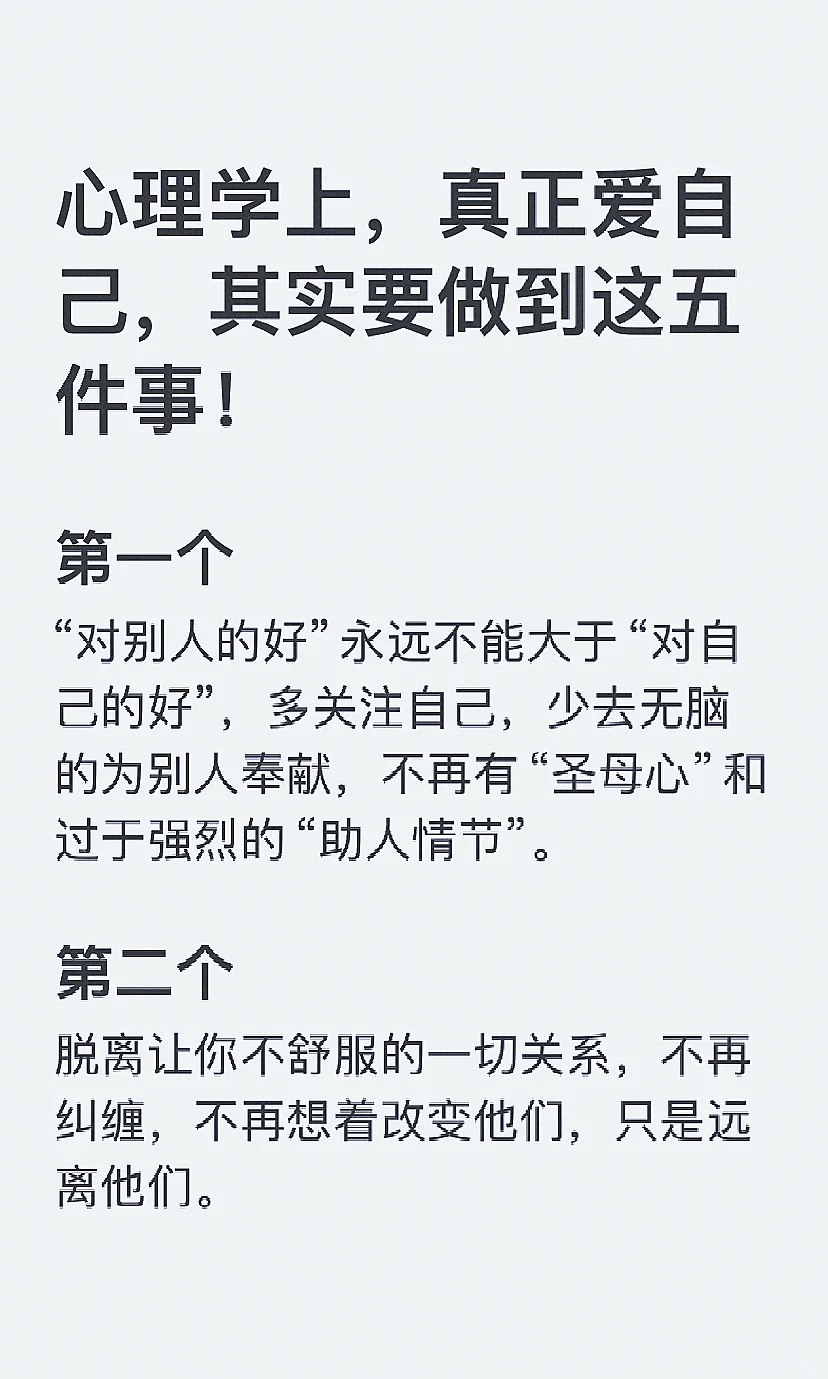 “对别人的好”永远不能大于“对自己的好”,多关注自己,少去无脑的为别人奉献,不再有“圣母心”和过于强烈的“助人情节”。