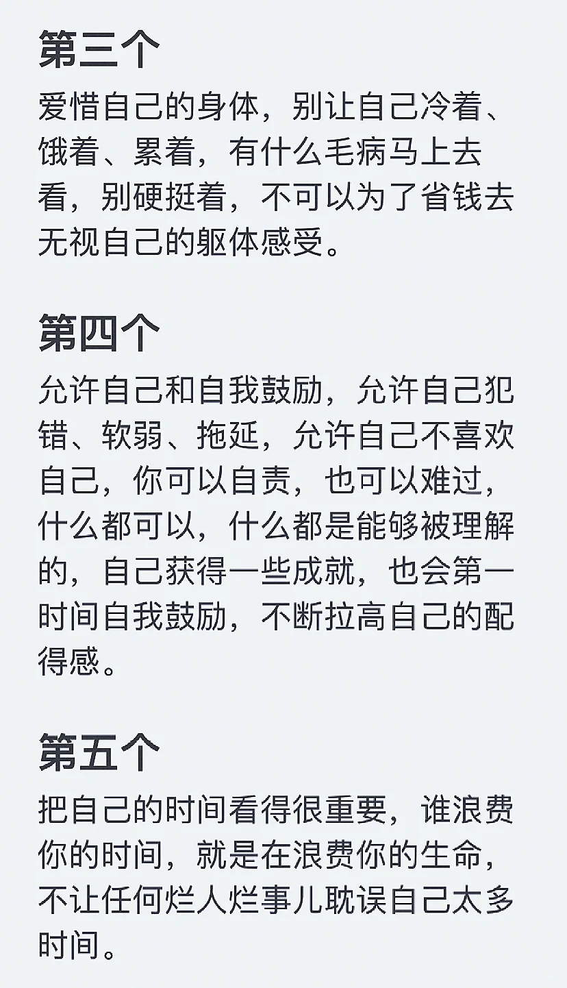 爱惜自己的身体,别让自己冷着、饿着、累着,有什么毛病马上去看,别硬挺着,不可以为了省钱去无视自己的躯体感受。